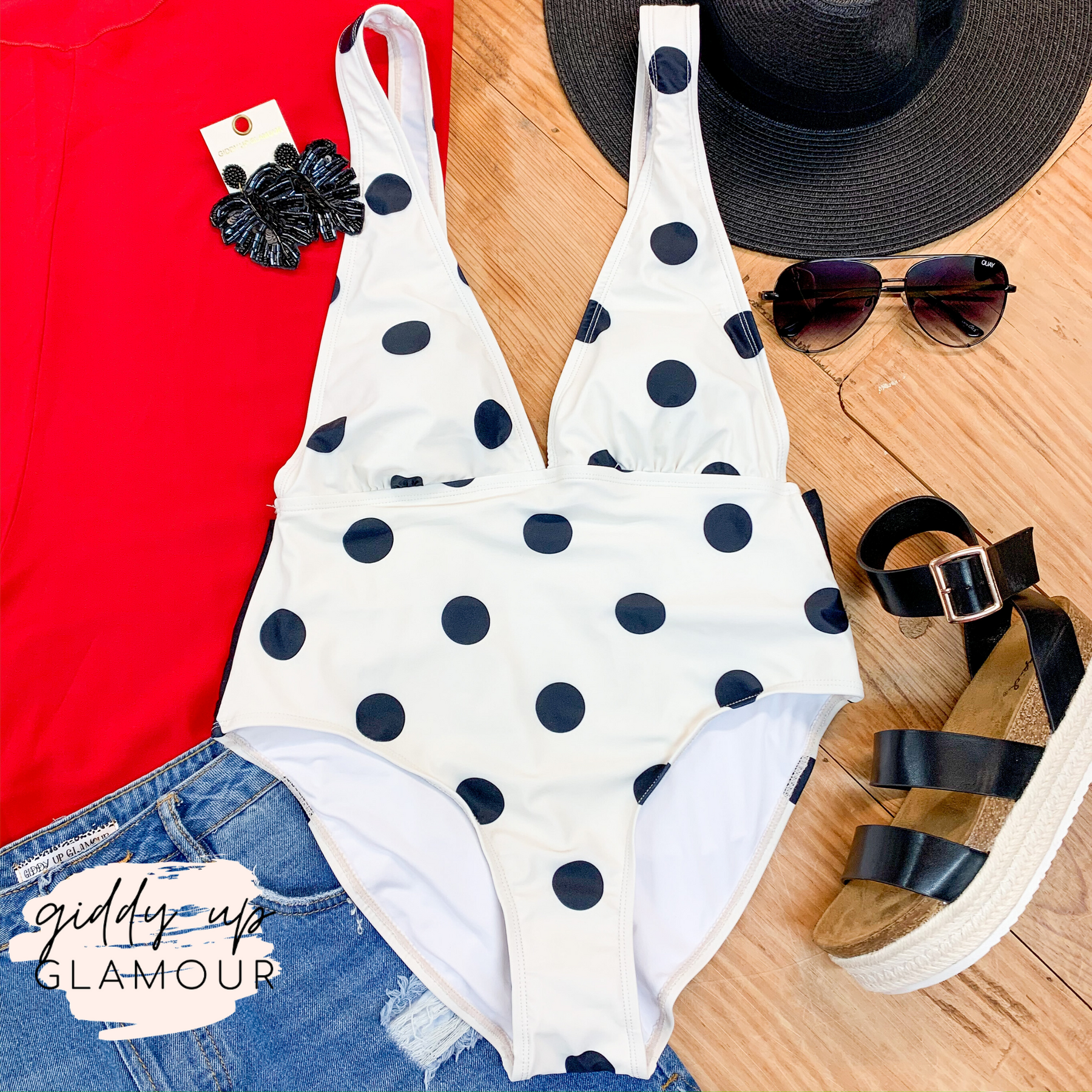Getting Hotter Deep V Neck Polka Dot One Piece Swimsuit with Tie in Ivory - Giddy Up Glamour Boutique