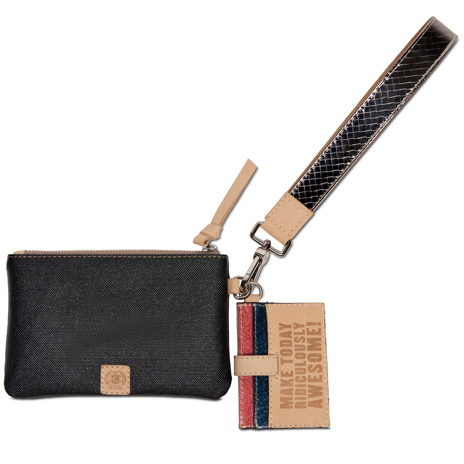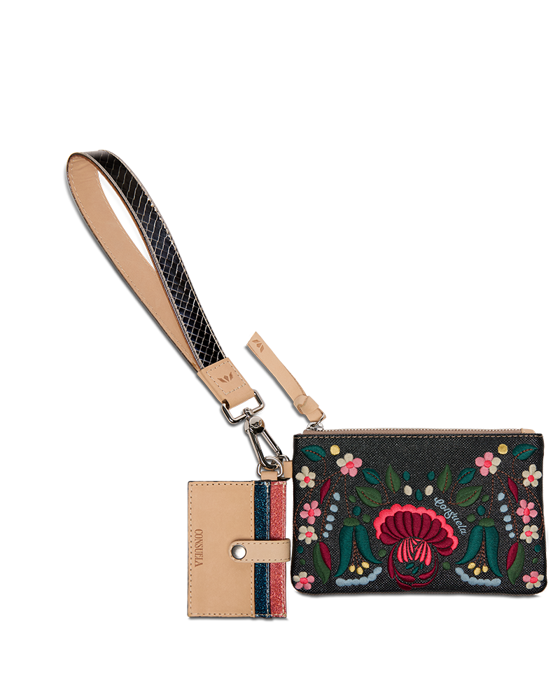 The Combi, a combination of on-the-go accessories, is a new way to carry your keys, cards, and the small stuff together or separately. This embroidered wristlet wallet includes a pocket pouch, secure card slot wallet and fits comfortably around your wrist - and this collection is the first time we have featured embroidery on a Combi!