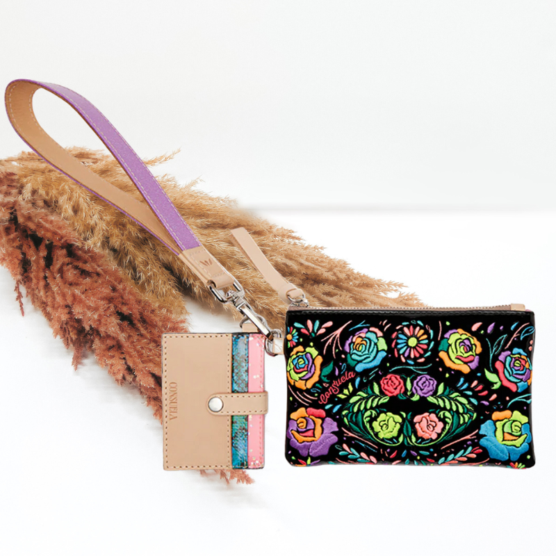The Combi, a combination of on-the-go accessories, is a new way to carry your keys, cards, and the small stuff together or separately. This embroidered wristlet wallet includes a pocket pouch, secure card slot wallet and fits comfortably around your wrist - and this collection is the first time we have featured embroidery on a Combi!