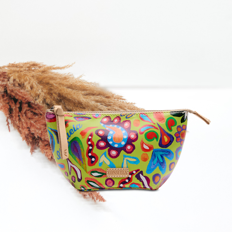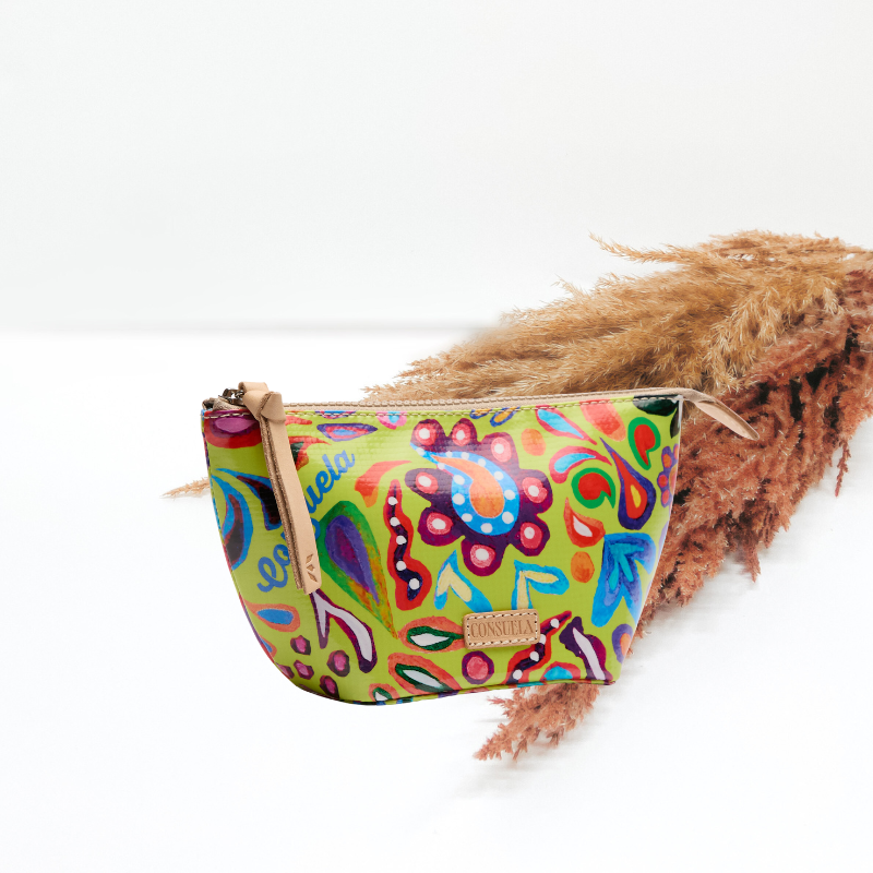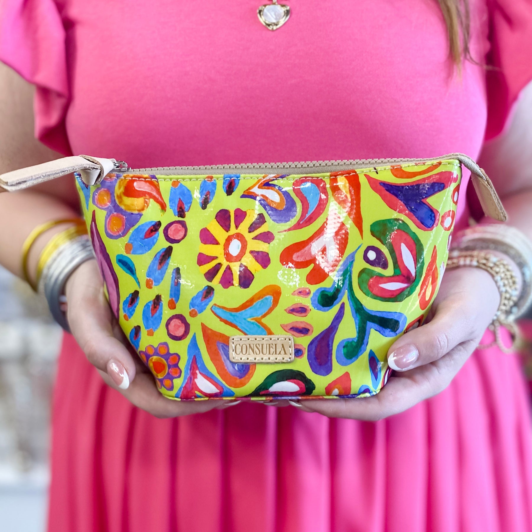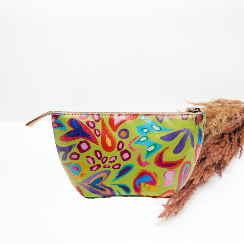 Experience a burst of energy with a vibrant mix of swirling shapes, paisley-like elements, and organic patterns. The sunny yellow background is adorned with pops of red, blue, pink, orange, and green, creating a dynamic and lively atmosphere. Reimagined to store cosmetics, tech gear, art supplies, and any odd & ends. Upgraded with a generous opening, spacious interiors, and a sturdy base.