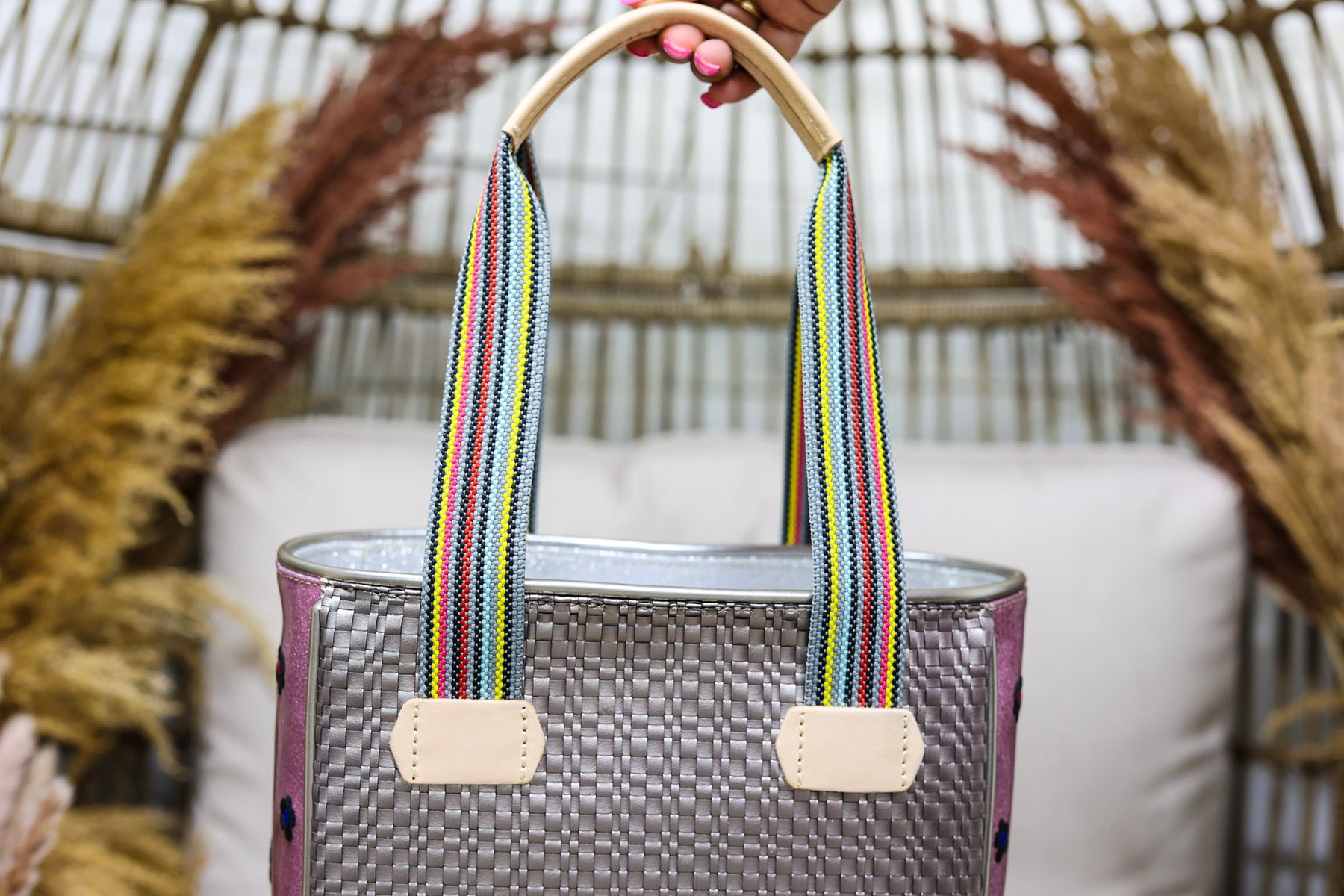 The Chica Tote is the smaller version of the signature Classic Tote. With a slim silhouette perfect for life-on-the-go, the chica carries all you need with ease. Topped with comfortable woven handles leather and crafter to hold its shape. Our tote features a roomy interior and pockets.