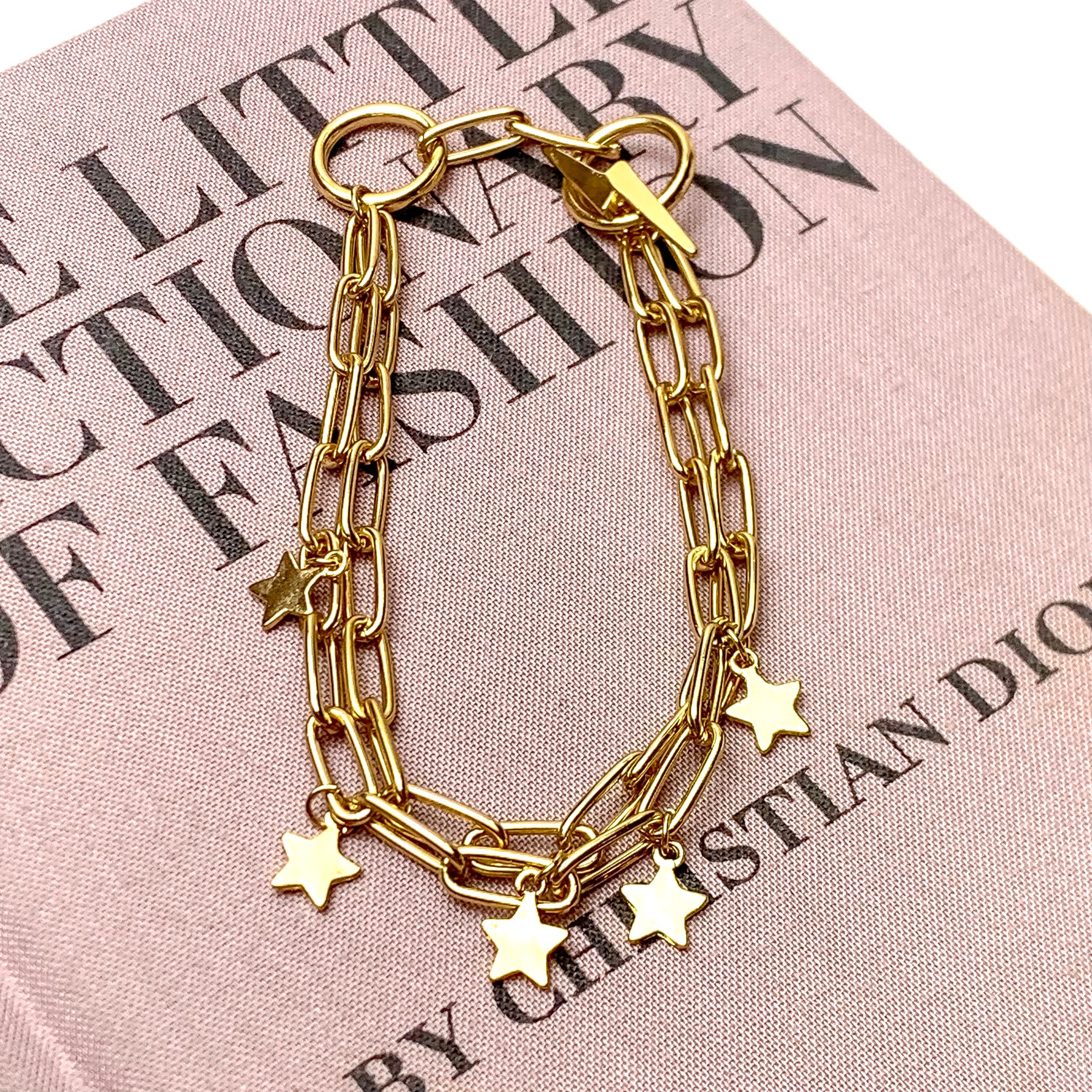 You'll have everyone falling for you while wearing this bracelet! This is one of our newest fav star bracelets! You have a gold double chain, tiny star pendants, and a lightning bolt pendant to hold the bracelet together.