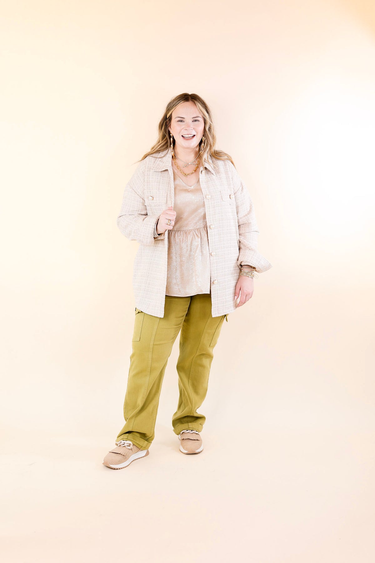 Brooklyn Buzz Pearl Button Up Tweed Shacket in Champagne Beige & Ivory