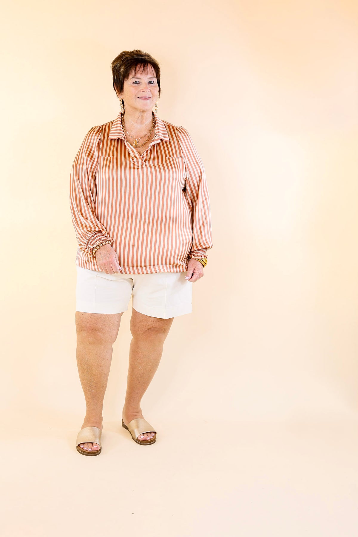 Hit refresh in the Back To Classic Top! This collared, v-neck piece is crafted with a unique combination of cream and dusty rose stripes. Its long, elastic ruffle cuffed sleeves give you the perfect boost of style and confidence. Put a new spin on classic looks with this timeless style!
