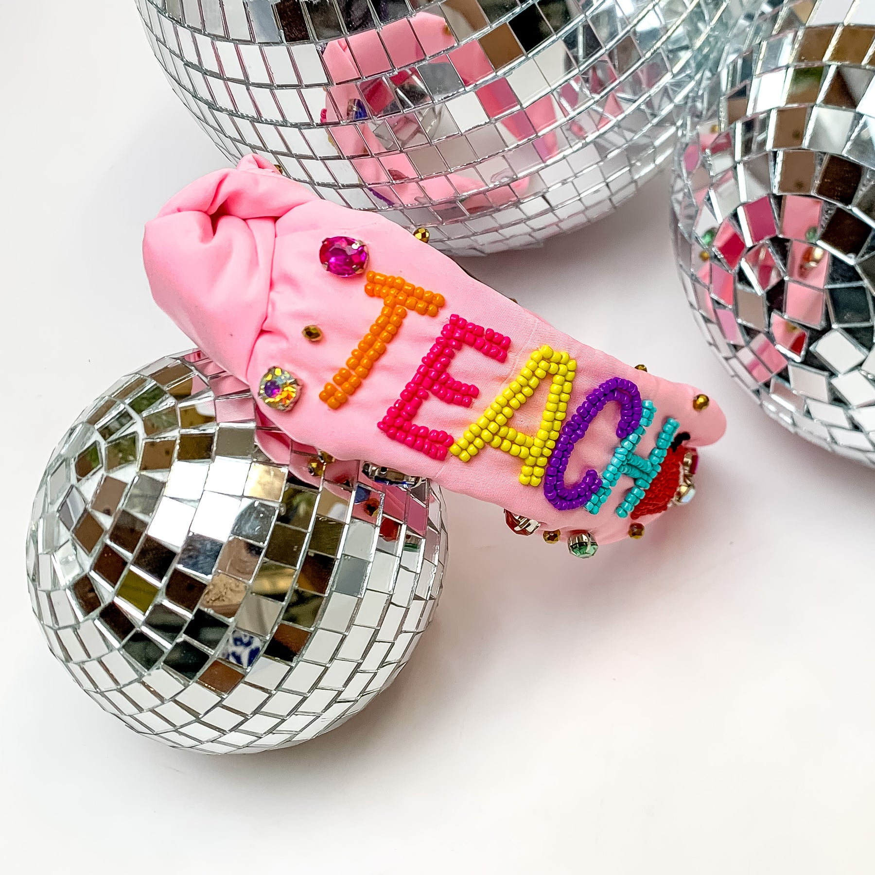 Beaded Multicolor Teacher Headband in Light Pink . This headband is pictured on a white background with disco balls next to the headband.