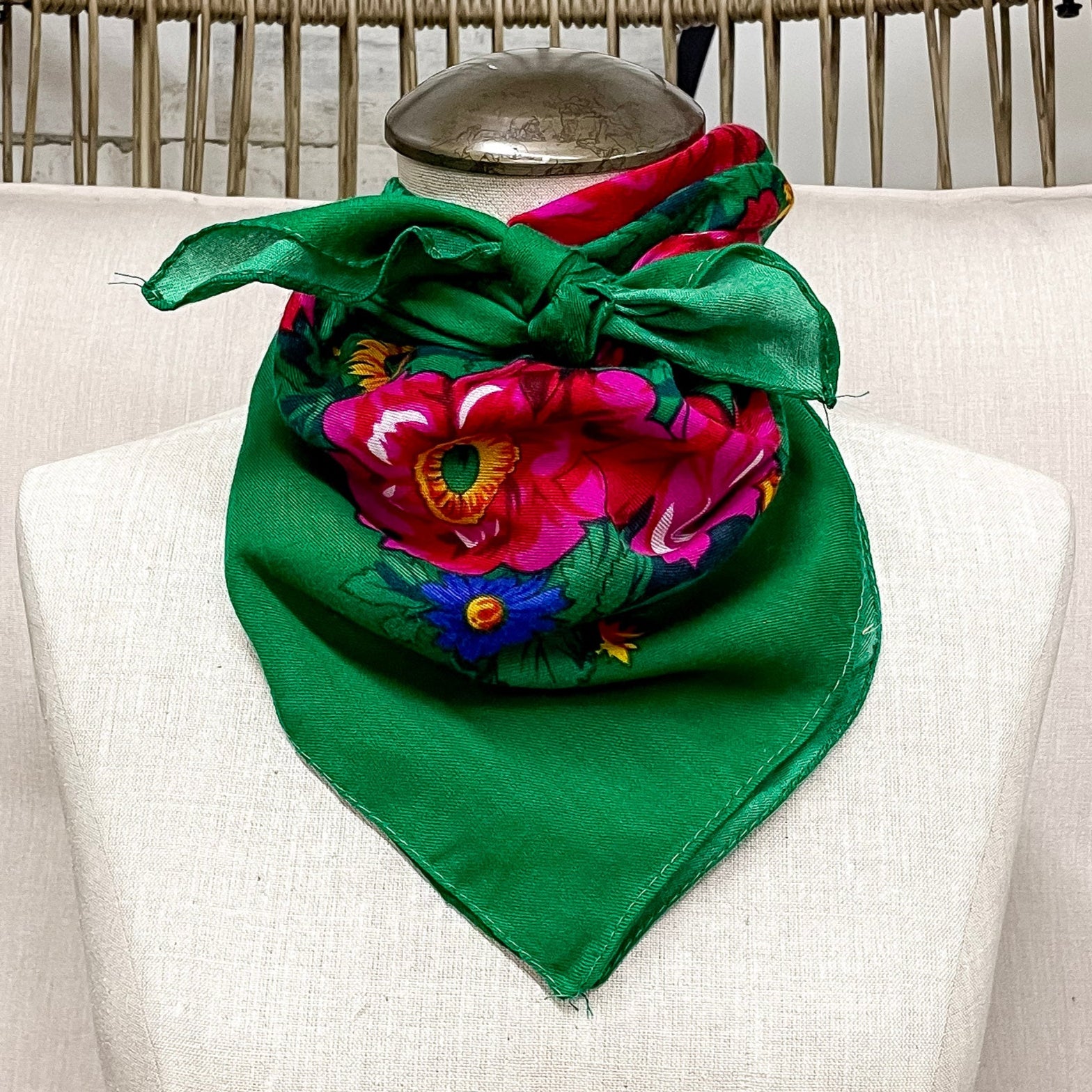 Bold, blooming, and impossible to ignore—this wild rag is the statement piece your wardrobe has been waiting for. With a green background and and the vibrant florals, this wild rag brings a touch of romance and confidence to any outfit. The oversized rose at the center is pure drama in the best way!