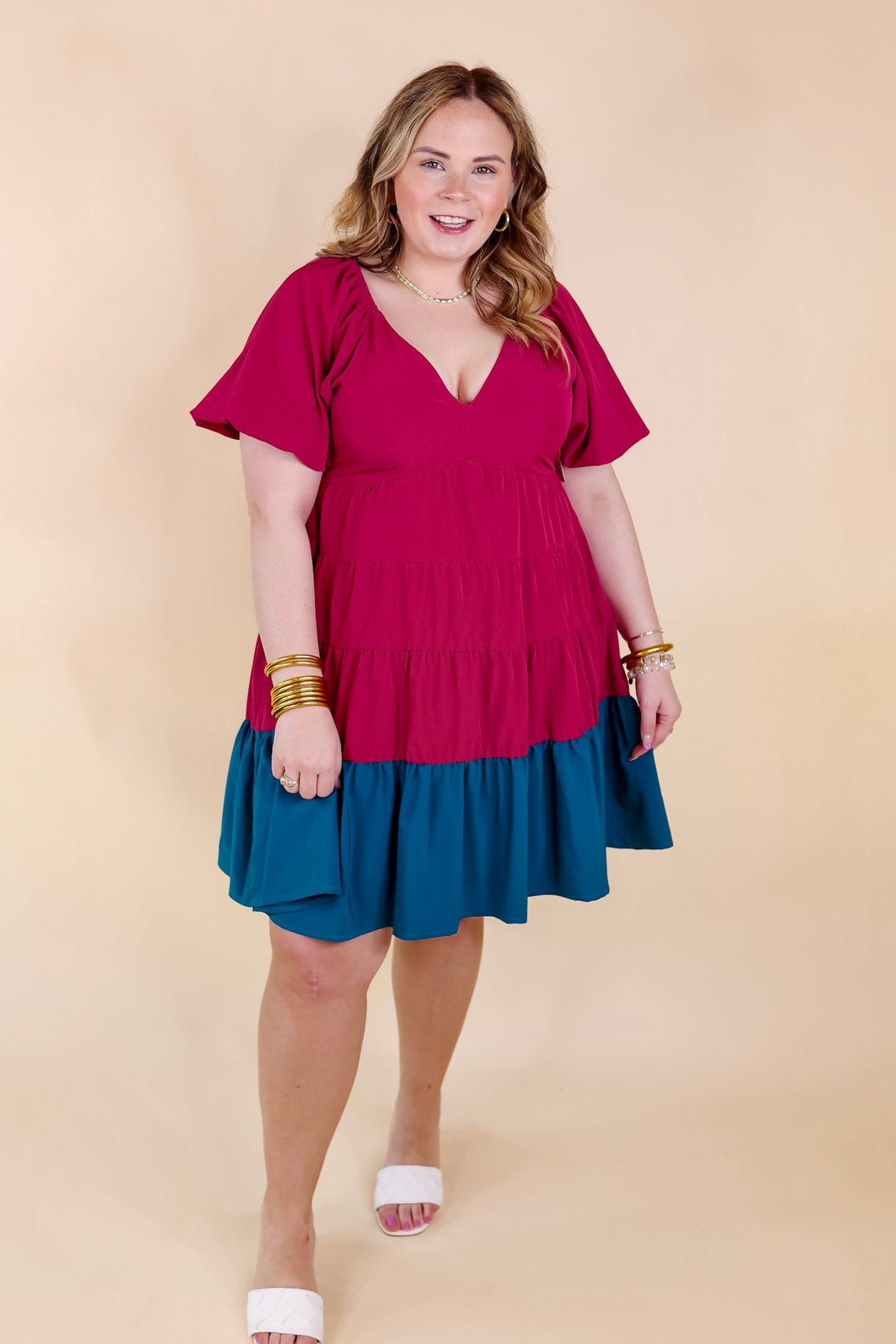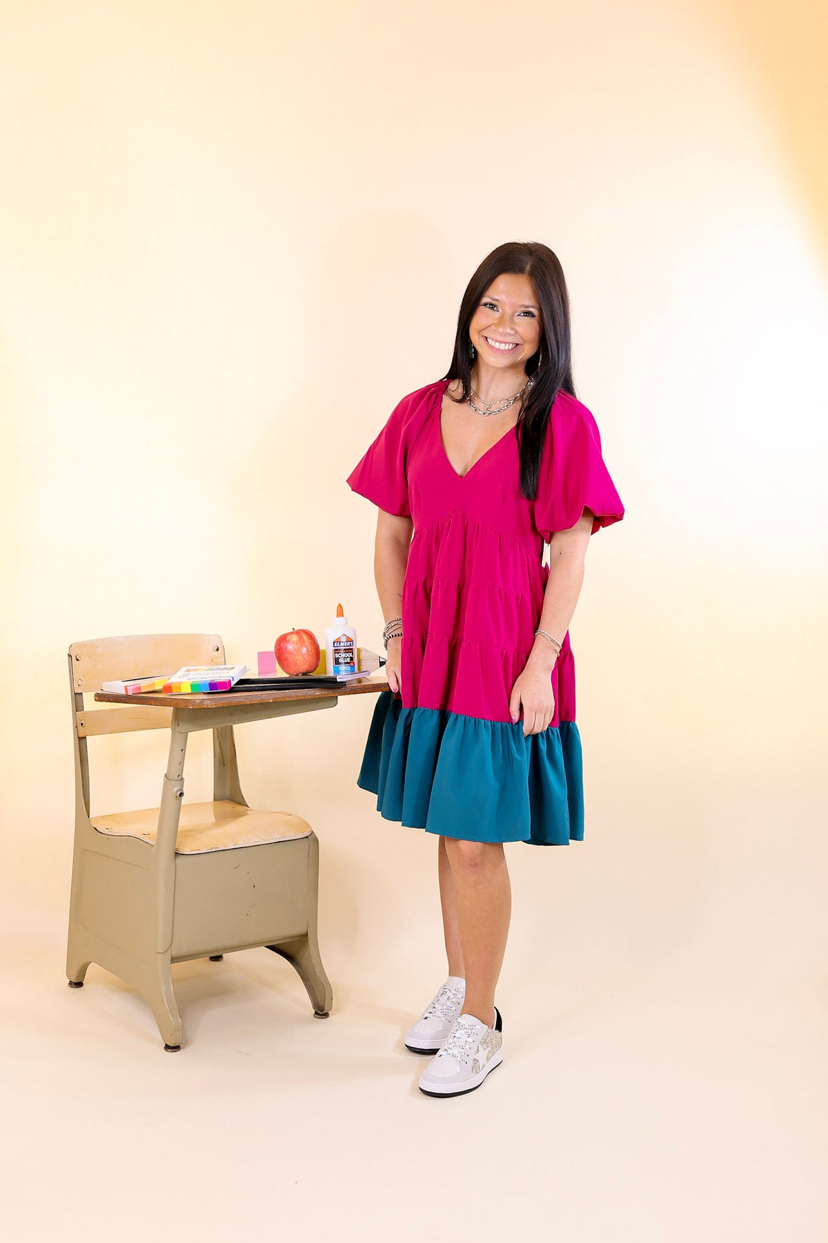 Trendy City Puff Sleeve Tiered Dress with Teal Hemline in Magenta