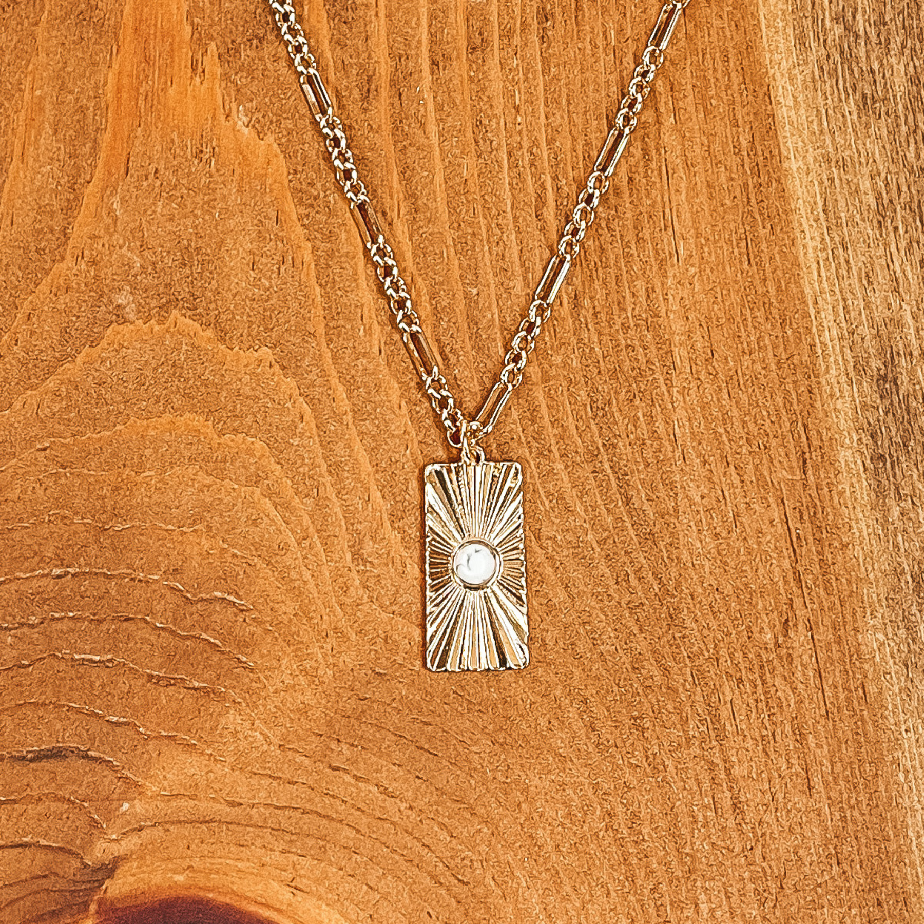 Convince Me Gold Necklace with Sunburst Rectangle Pendant and Small Stone in White