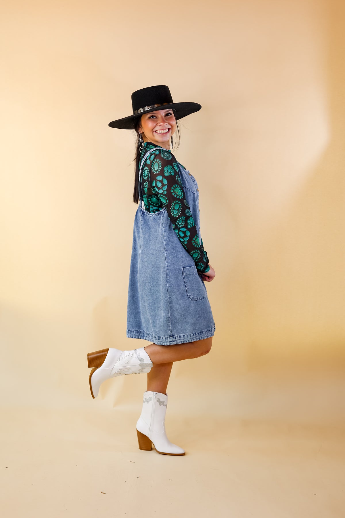A chic, but delicate light wash denim dress with two front pockets, button up front, thin straps, and criss cross back. Pair this adorable dress with some Dingo boots and you'll be the talk of the neighborhood!