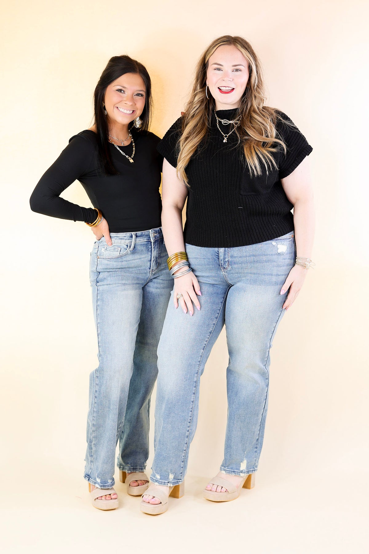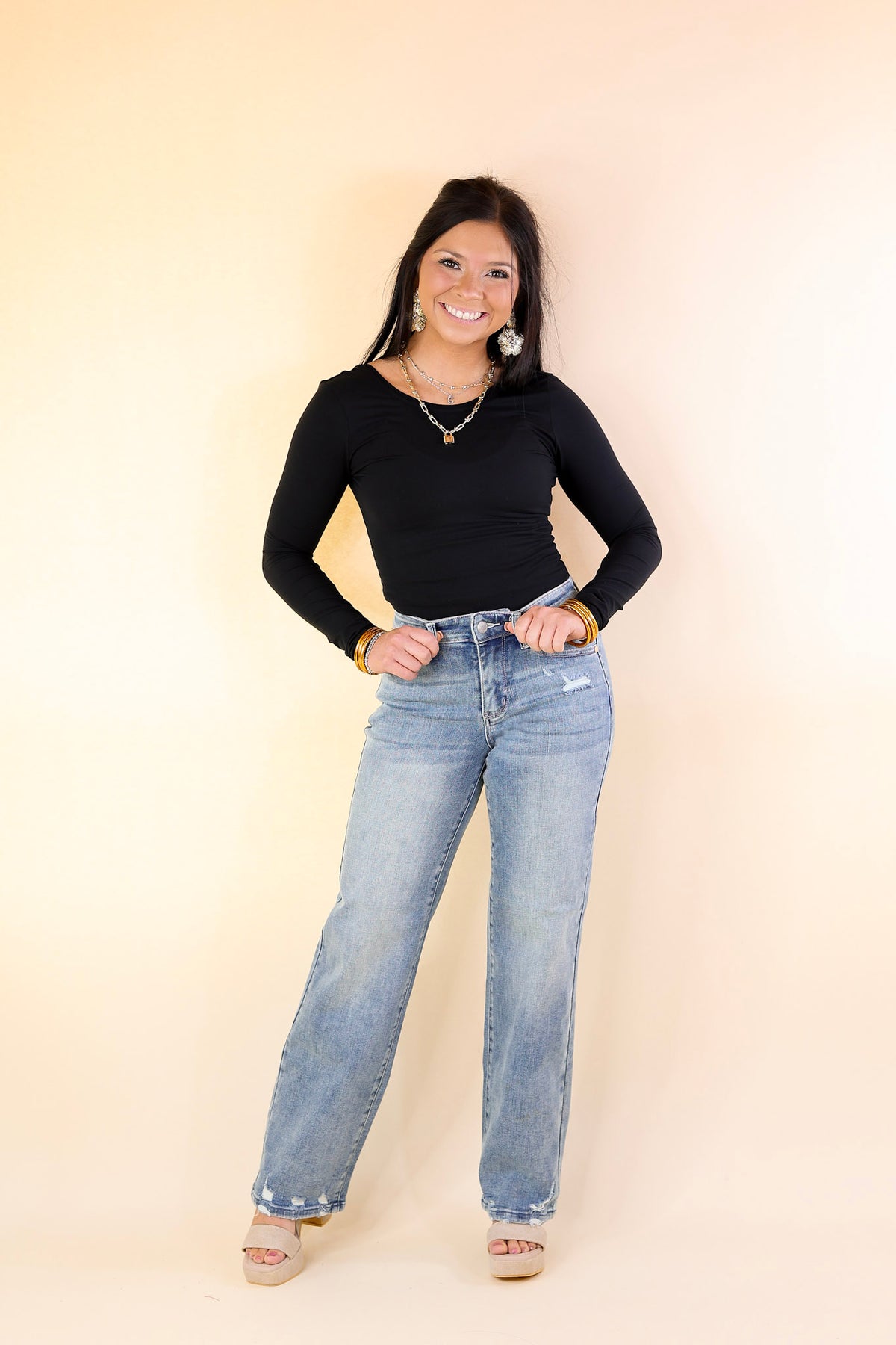 Judy Blue | Elegant Edge Straight Leg Jean with Distressed Hem in Medium Wash