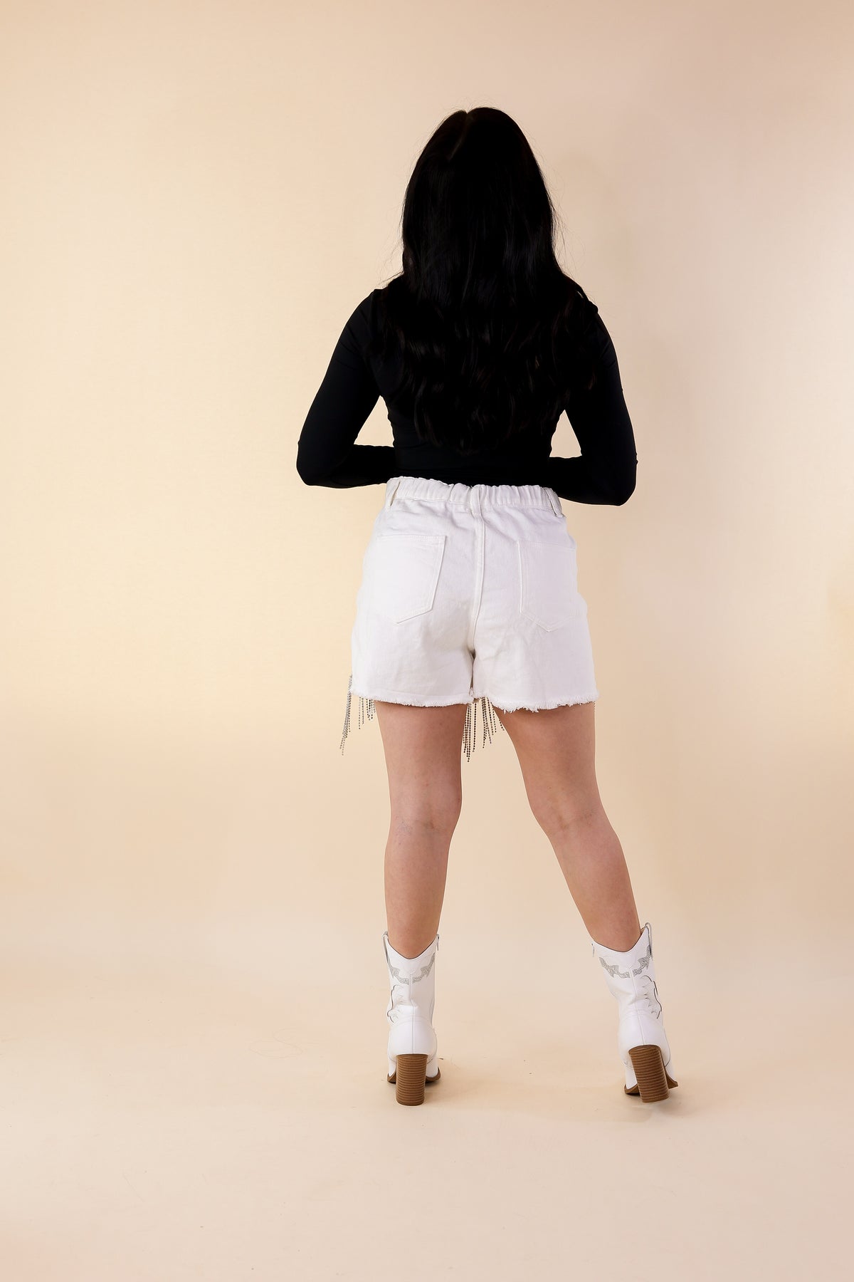 Saddle up and get ready rock these adorable new shorts! They include a crystal fringe across the thighs, and a cut off hemline. Pair these with boots and a bodysuit and you'll be a ready to saddle up, babe!
