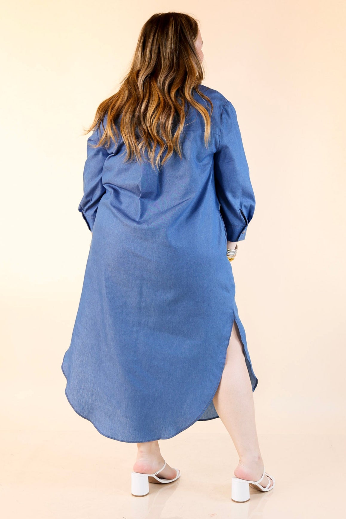 Classic denim meets timeless charm in the Southern Chic dress. Designed with 3/4 sleeves, a structured collar, and a full button-up front, this midi-length denim dress brings effortless Southern style to your wardrobe. Side slits add a flattering touch of movement, while a single front pocket keeps it casually cool. Whether you’re headed to brunch, the rodeo, or just out and about, this dress does it all — with style and comfort to match.