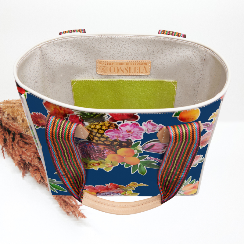 An unexpected still life of flowers, fruits and disco balls on a rich shade of indigo blue. The Classic Tote, signature consuela silhouette since the beginning. This tote bag hold its shape while carrings all of the essentials. You're ready for anything that comes your way!