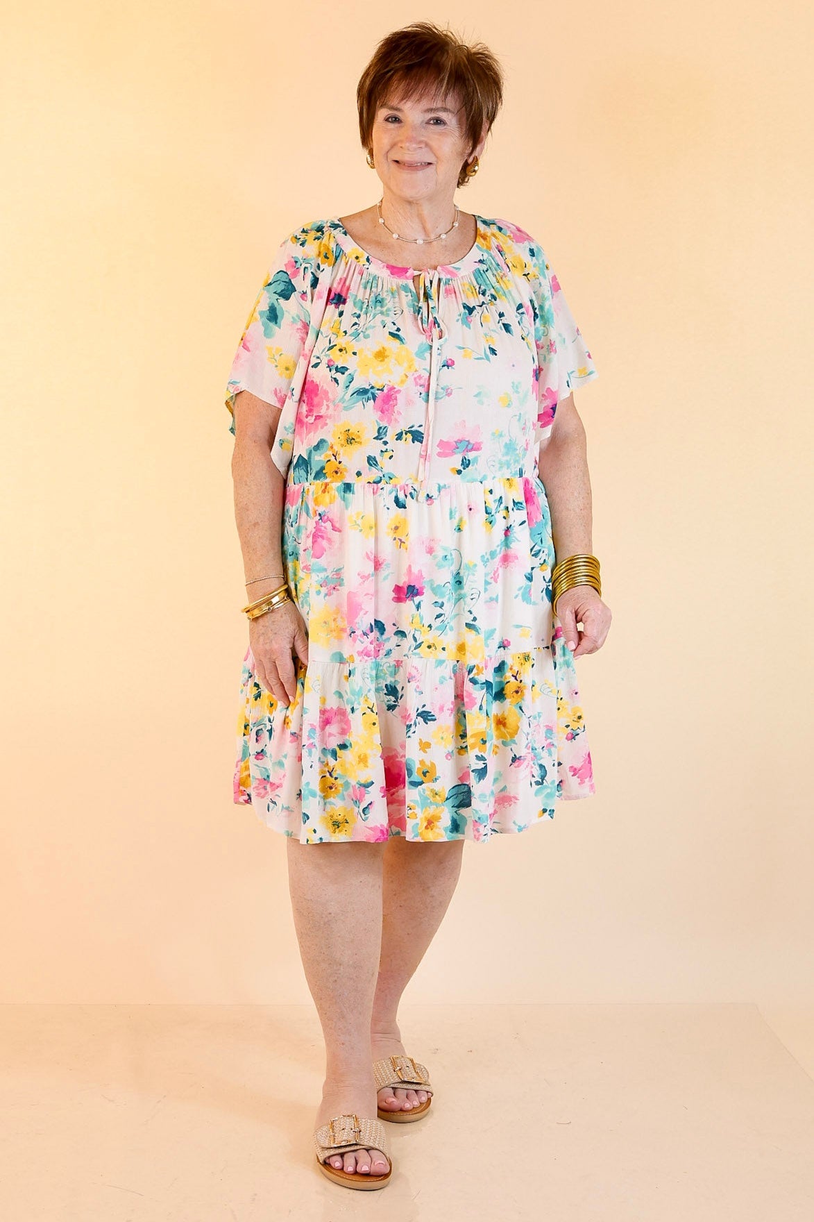 Escape to your own Piece of Paradise in this effortlessly charming ivory floral dress. Featuring short sleeves, a flirty tiered skirt, and a keyhole neckline with a sweet tie detail, it’s the perfect blend of playful and feminine. Fully lined for a comfortable fit, this dress pairs perfectly with your favorite booties for an easy, put-together look you'll want to wear on repeat.