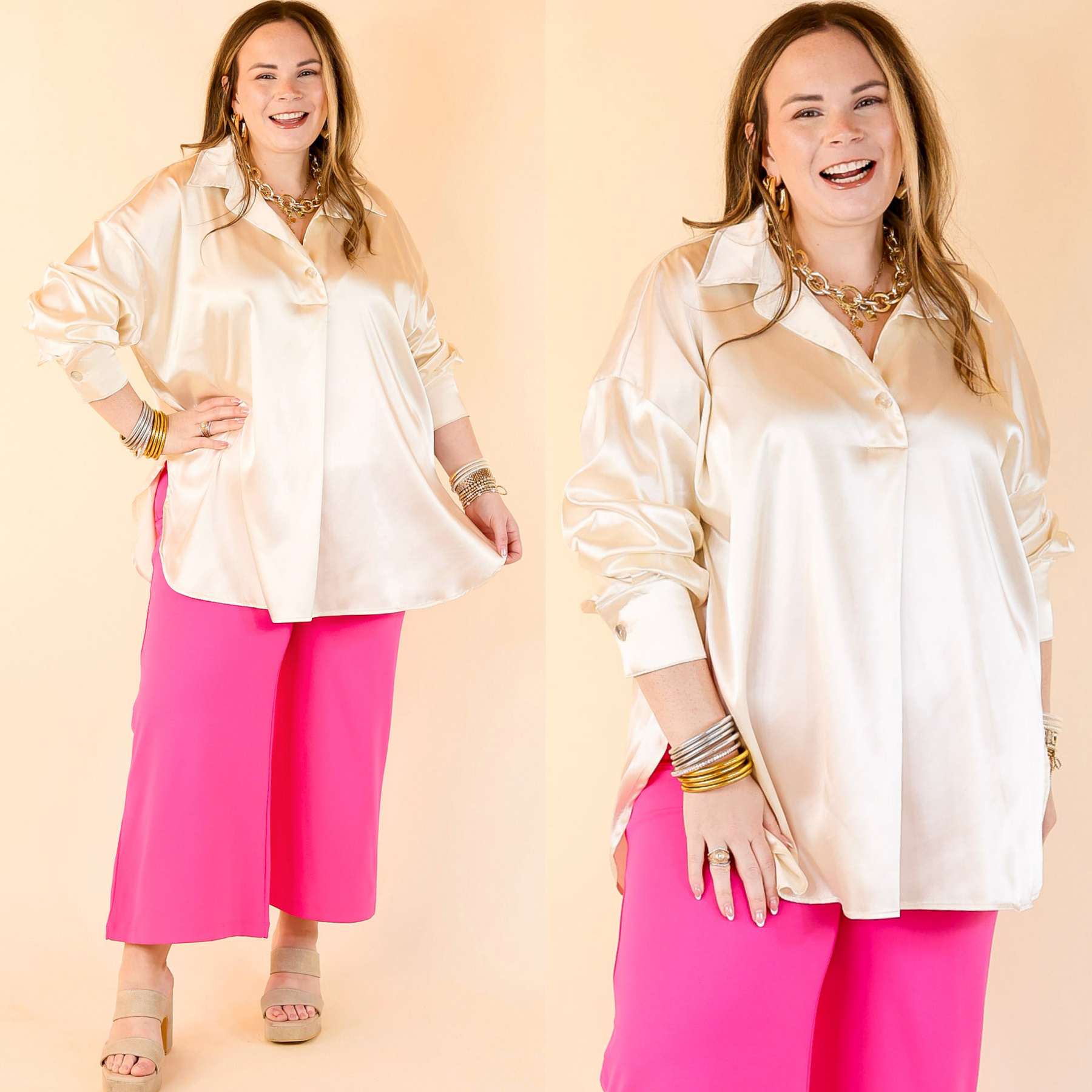 Start The Show Satin Long Sleeve Collared Top in Ivory