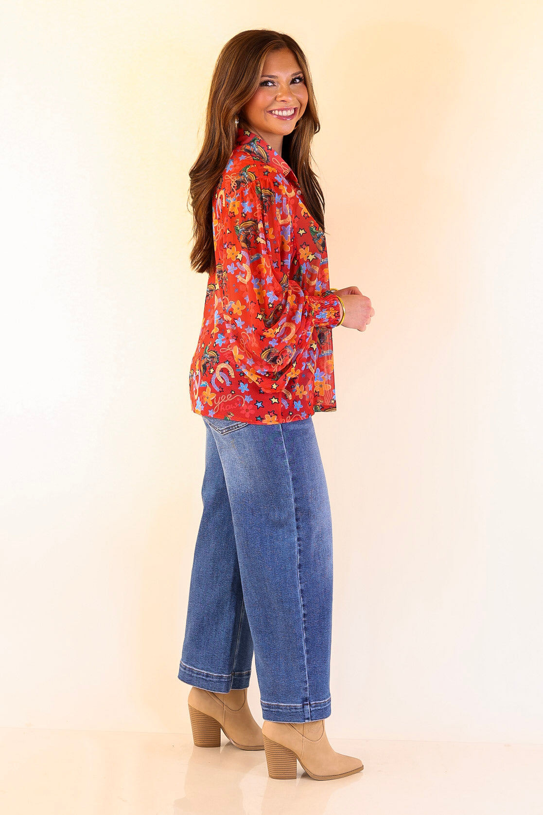 Winning Streak Button Up Collared Horseshoe Print Mesh Top with Long Balloon Sleeves in Red