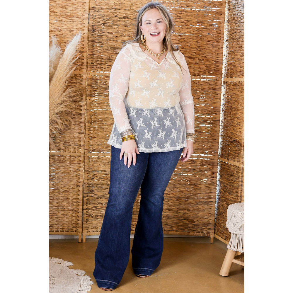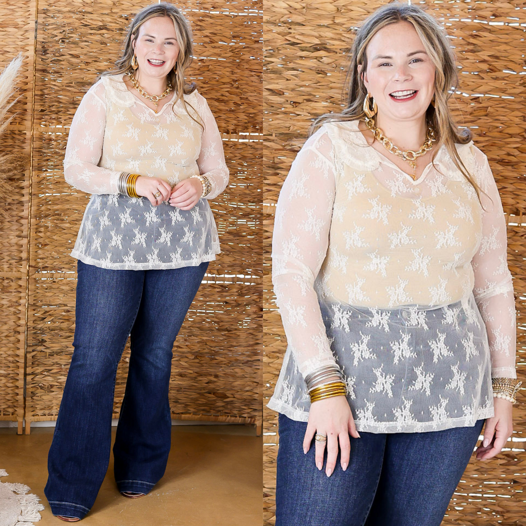Pretty and Poised Floral Print Lace Top with Ruffle Collar in Ivory