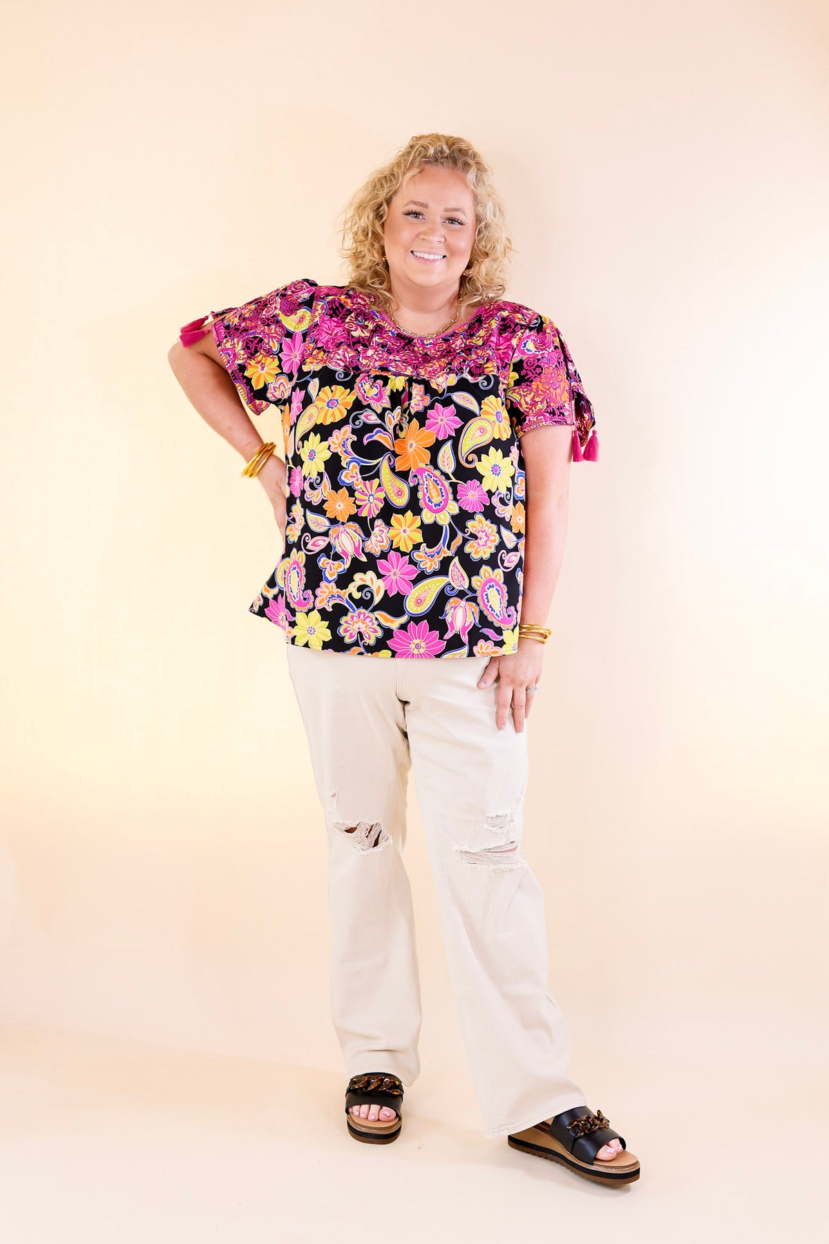 Sweet And Charming Paisley and Floral Print Top with Purple Floral Embroidery in Black - Giddy Up Glamour Boutique