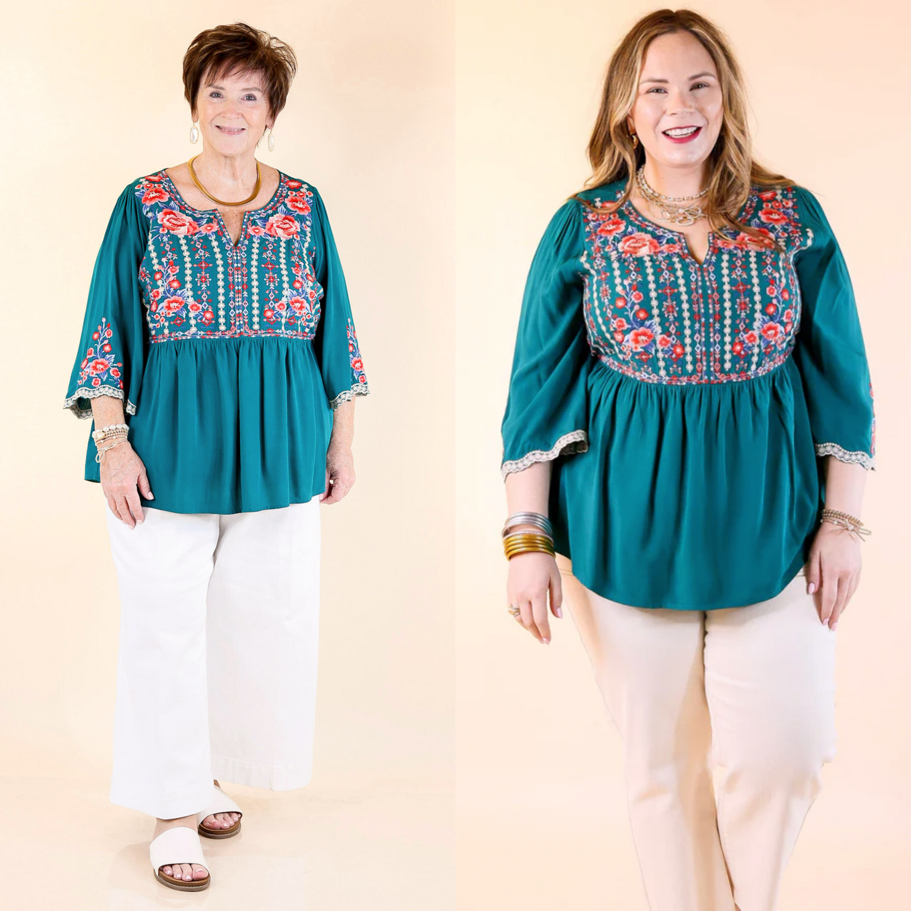 Already Mine 3/4 Bell Sleeve Embroidered Babydoll Top in Teal