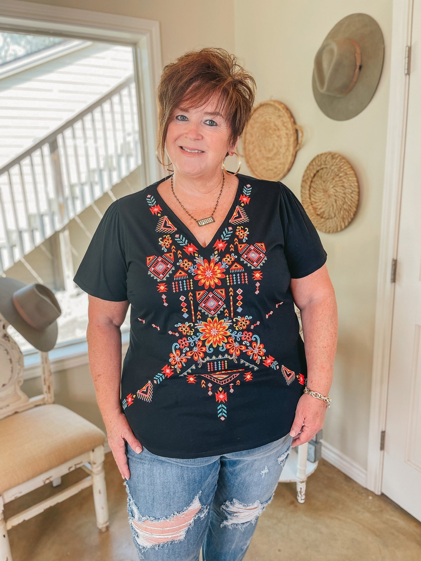Last Chance Size Small | Southwest Senorita Embroidered Short Sleeve V Neck Top in Black