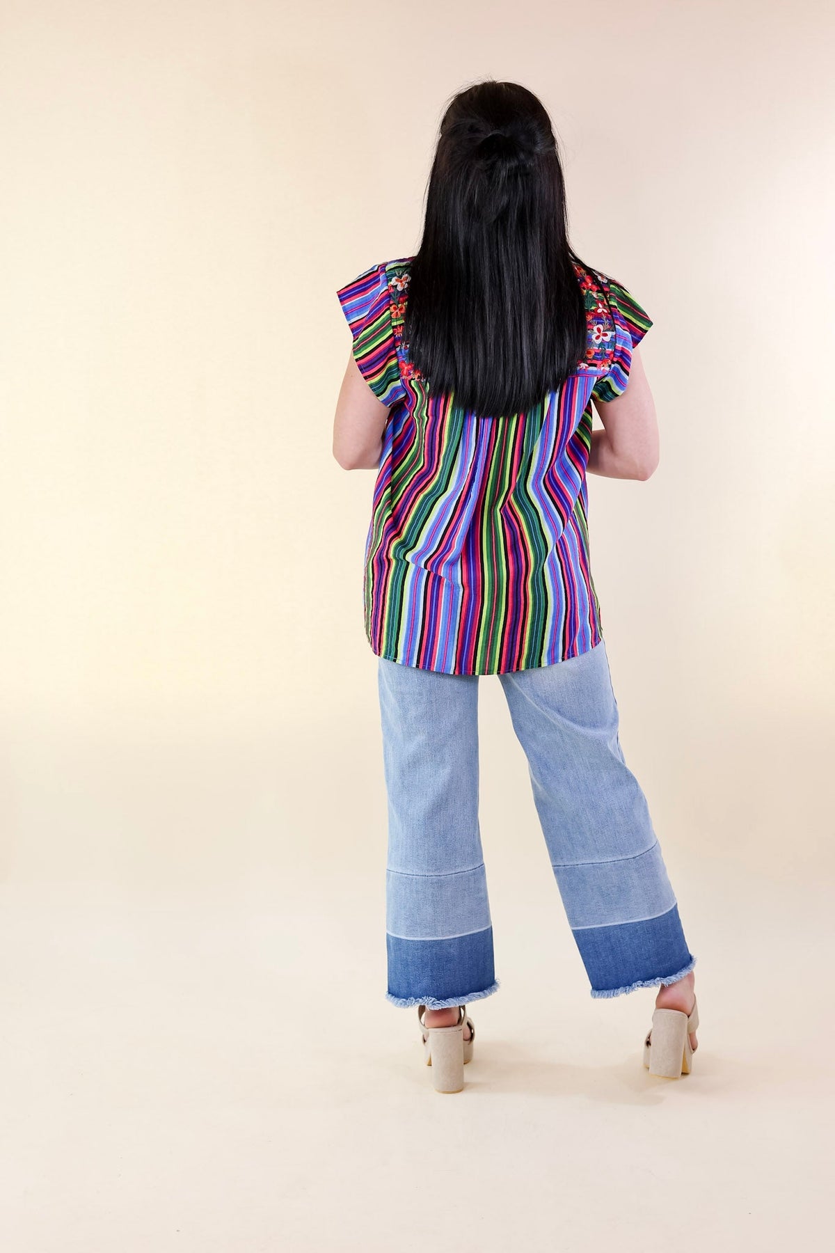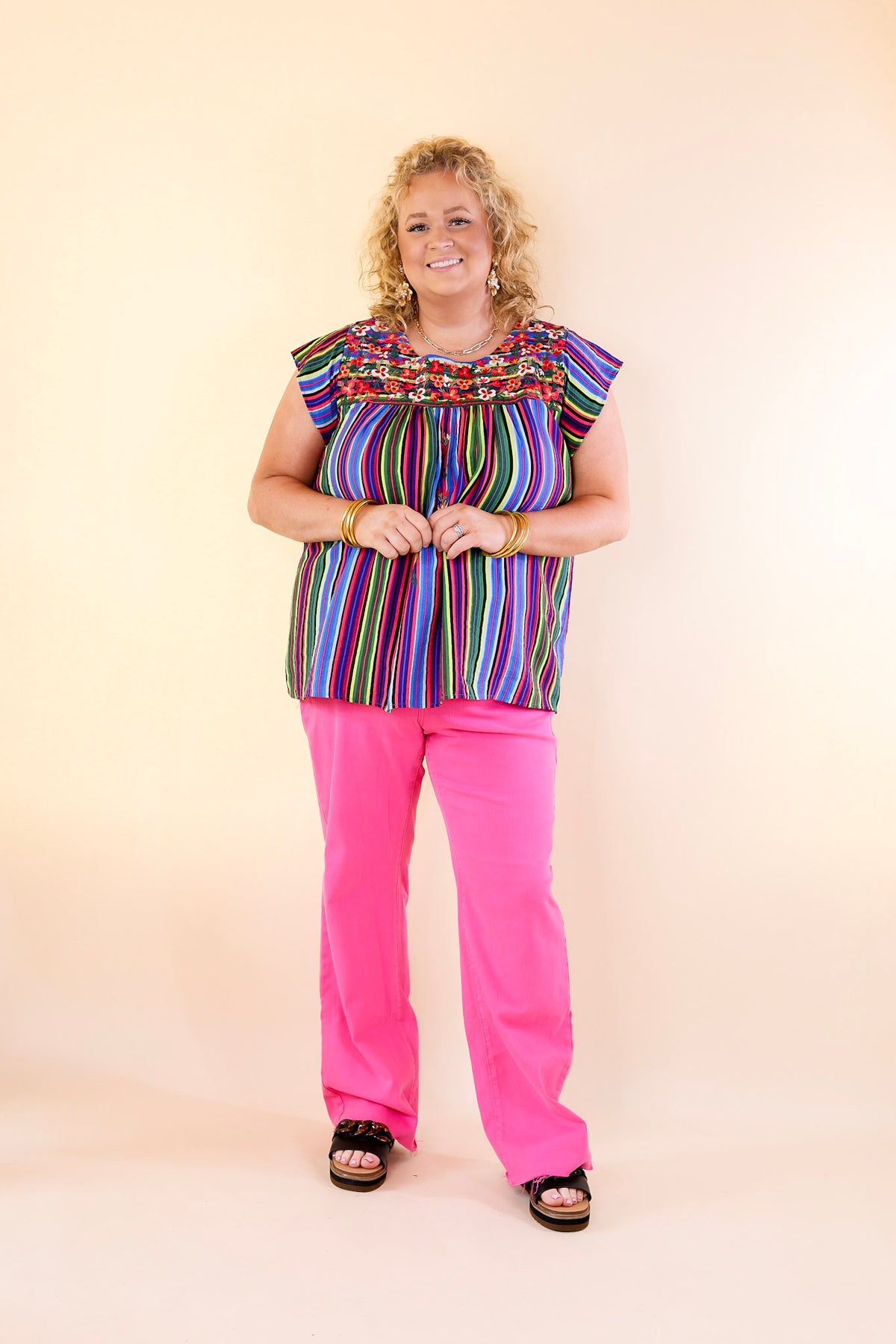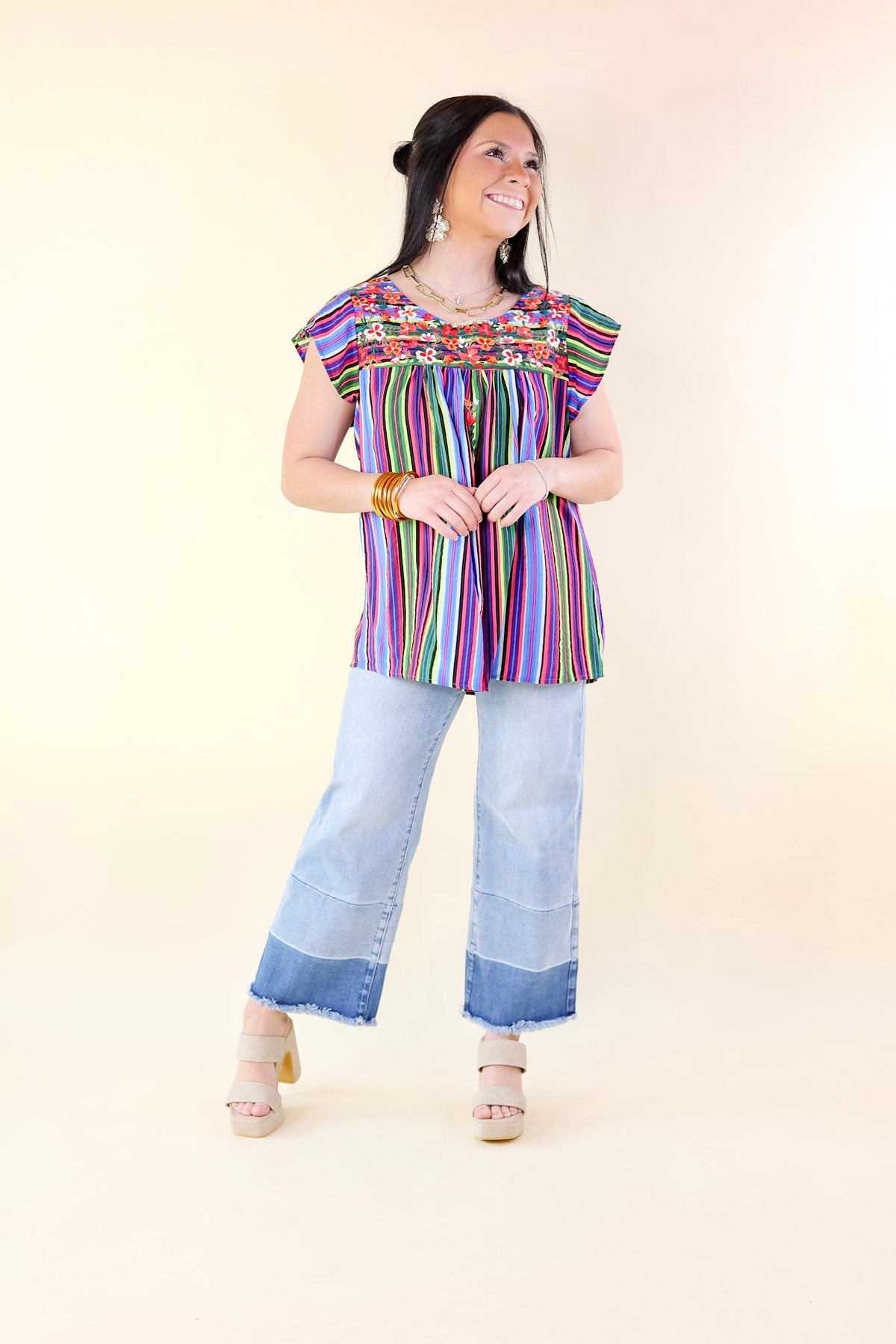Introducing the "Lajitas Lady" top: a chic blend of classic elegance and modern flair. Featuring cap sleeves, a round neck, and captivating floral embroidery, this top is a statement piece. The playful stripes in green, blue, and pink add a fresh twist. Versatile and stylish, it transitions effortlessly from day to night. Elevate your wardrobe with the "Lajitas Lady" top and make every outfit unforgettable.