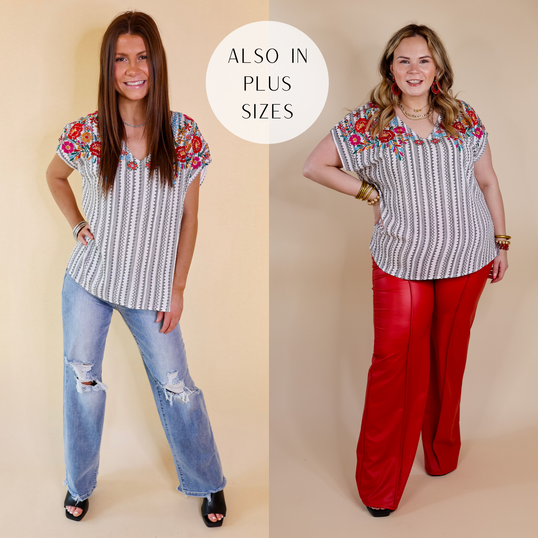 Happy Rush Tribal Stripe V Neck Top with Floral Embroidery in White