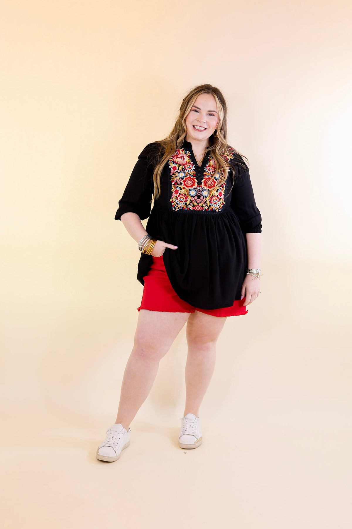 You're invited to join us with great style in this new top! It includes a floral embroidered top with a notched neck, half sleeves, a babydoll style body, a classy look!