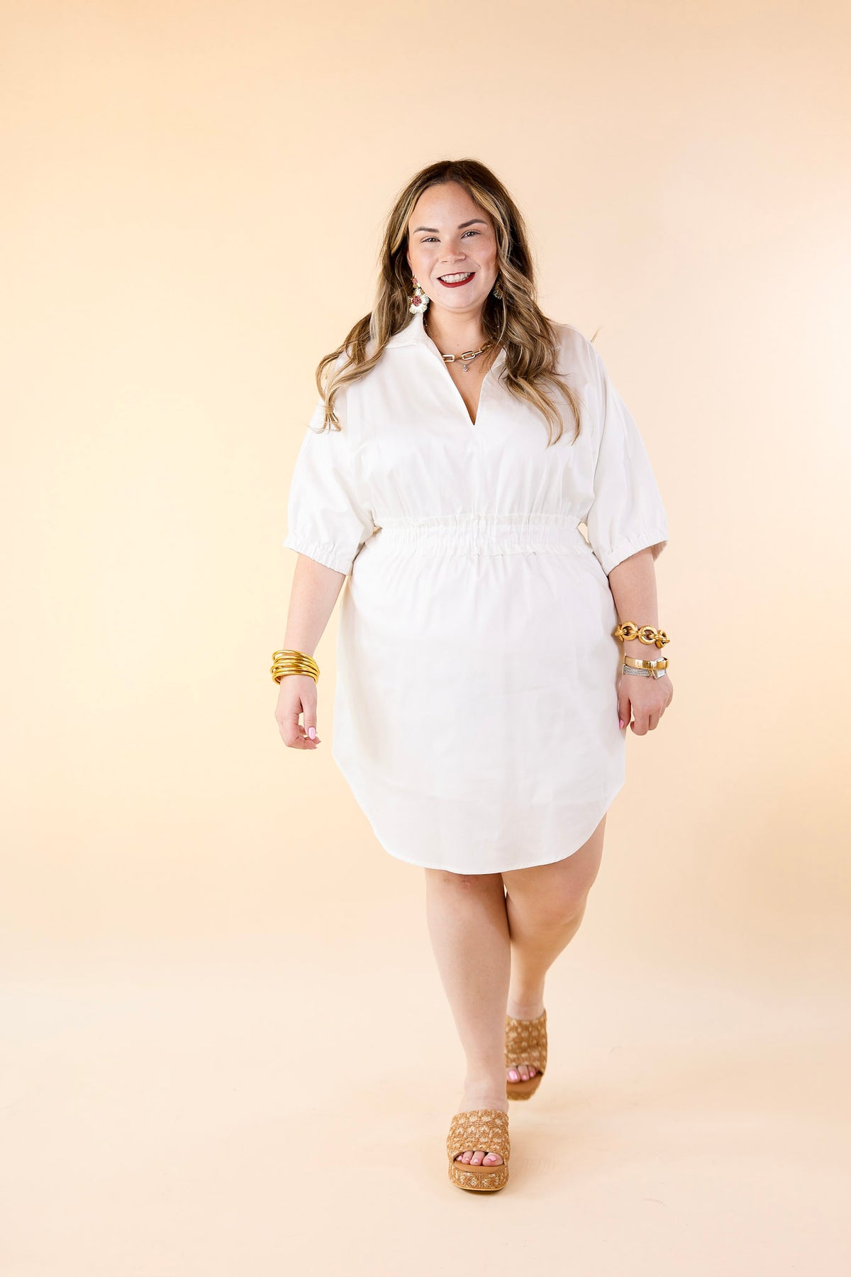 Introducing the Palmer Dress by Emily McCarthy: A fusion of timeless charm and contemporary elegance. Elevate your style with the ruffle cinched waist detail that adds a touch of femininity, while the ultra-flattering curved shirttail hem exudes sophistication. Perfectly tailored to knee length, this dress features convenient side slit pockets for functionality without compromising style. The fitted elastic waist ensures a comfortable yet chic look, while the classic stand collar and notched neckline add a refined touch. Versatile and refined, the Palmer Dress effortlessly transitions from day to evening, making it an essential addition to your wardrobe.