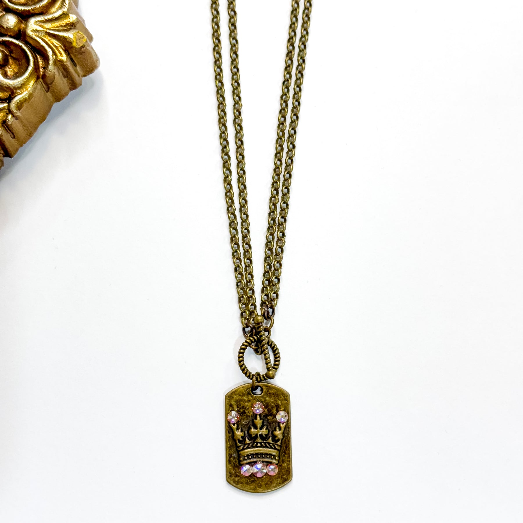 Introducing the Crowned Jewel Necklace, a double-strand bronze-tone beauty featuring a toggle front and a rectangular pendant adorned with a crown and accented with small round AB crystals. This necklace exudes regal charm and timeless elegance, perfect for adding a touch of sophistication to any outfit. Elevate your ensemble with this exquisite piece that combines classic design with a hint of sparkle. Pair with our matching earrings for the full look!