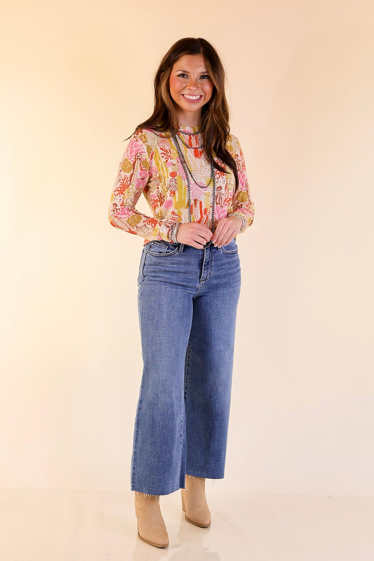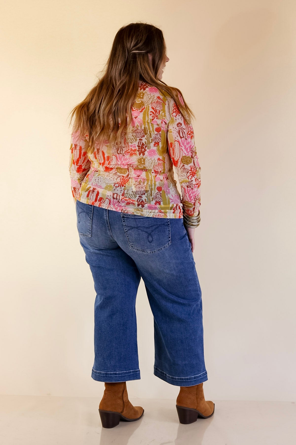 Western Dream Cacti Print Mesh Long Sleeve Top in Cream, Olive Green and Pink
