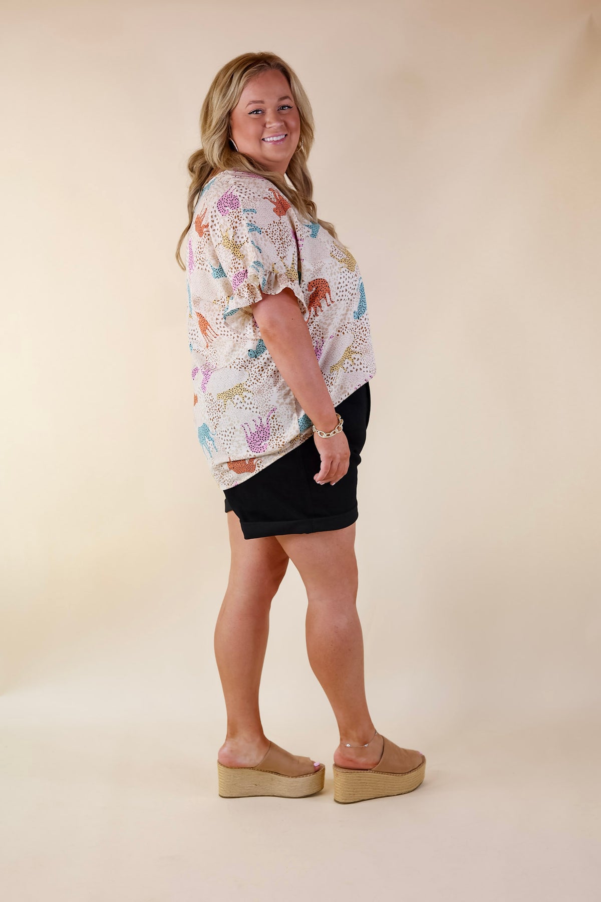 Discover your 'Best Version' with our latest top! Boasting a contemporary v neckline and charming short ruffle sleeves, this piece exudes modern elegance. Adorned with a playful mix of pink, blue, yellow, and orange cheetah prints, it's the perfect blend of chic and fun. Elevate your style effortlessly and embrace your unique self.