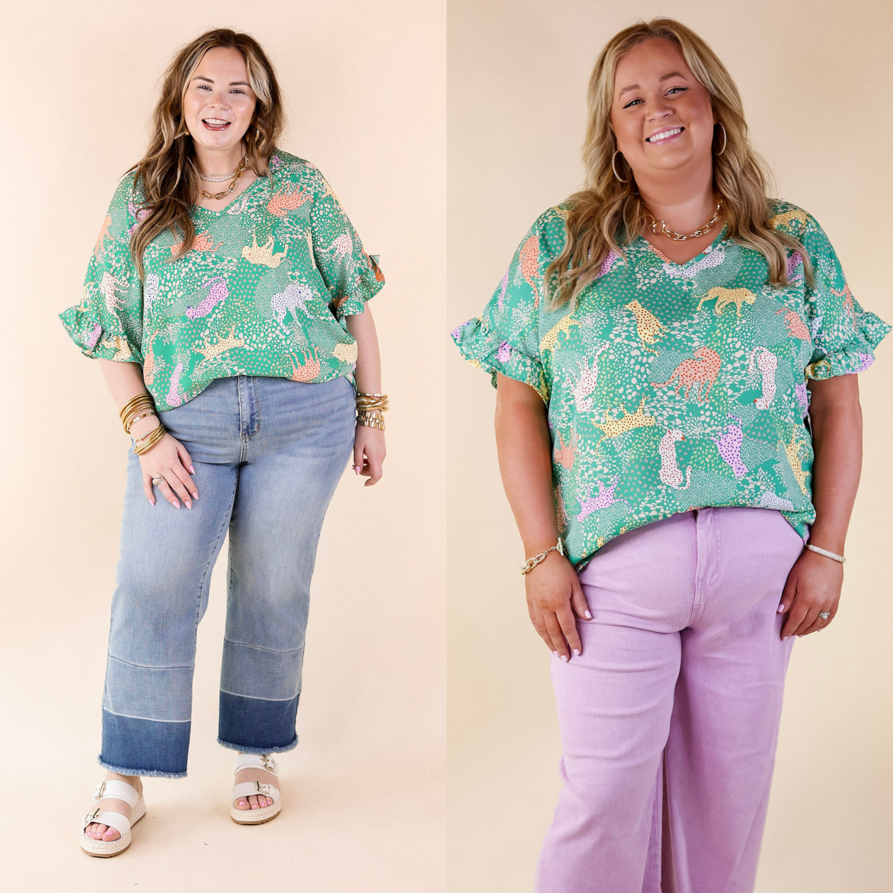 Best Version Cheetah Print V Neck Top with Ruffle Short Sleeves in Green Mix