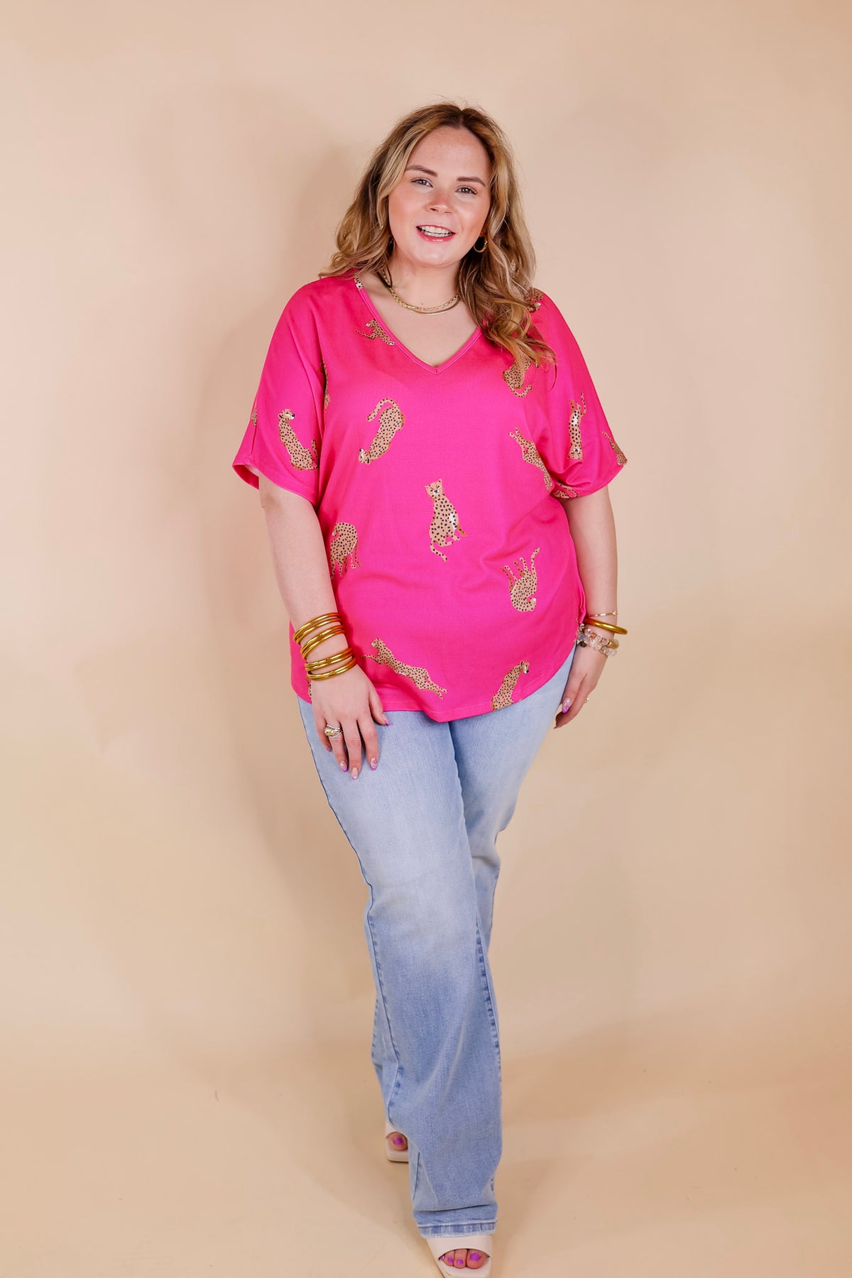 Wild Side Cheetah Print V Neck Top with Short Sleeves in Hot Pink