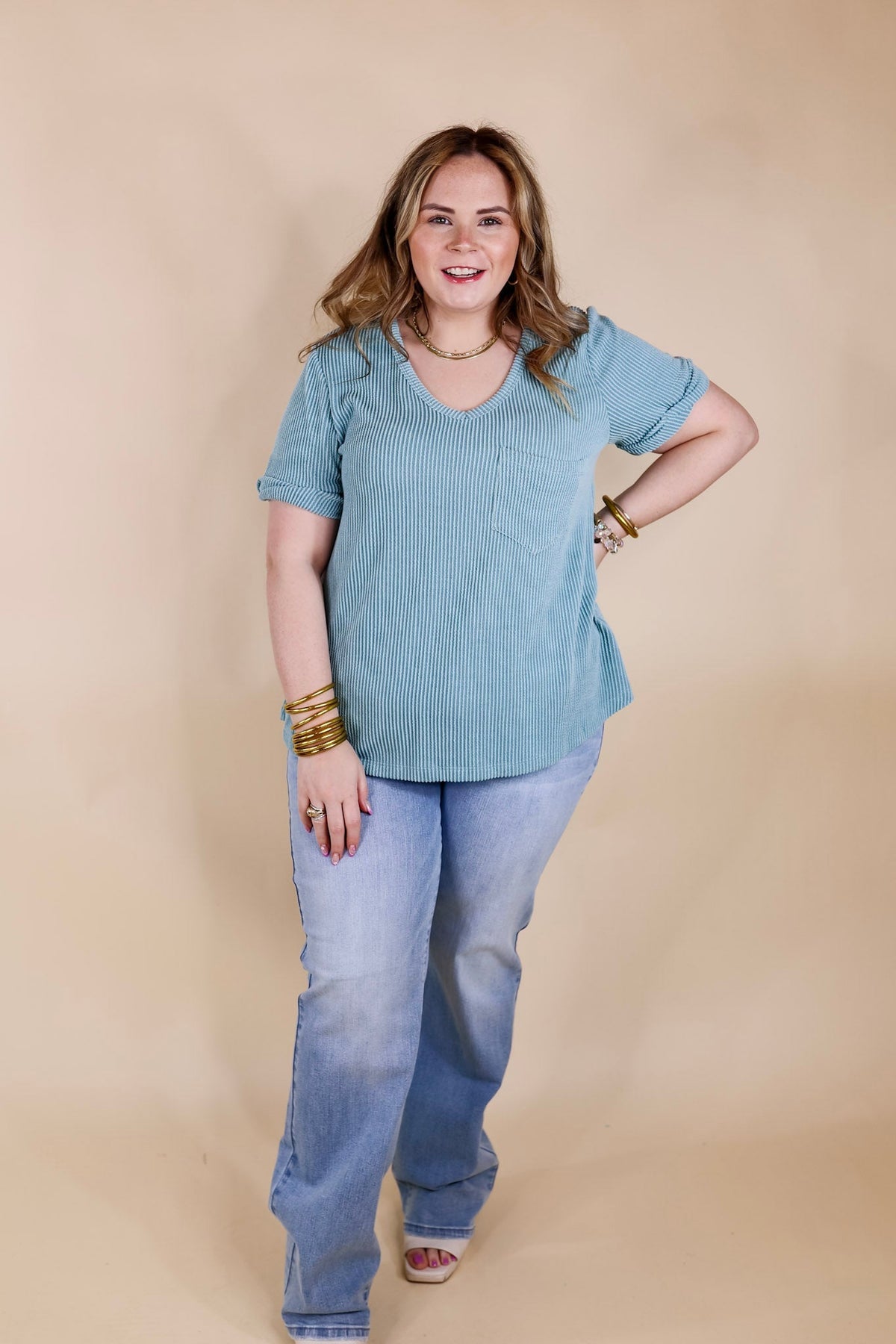 Only True Love Ribbed Short Sleeve Top with Front Pocket in Dusty Turquoise - Giddy Up Glamour Boutique