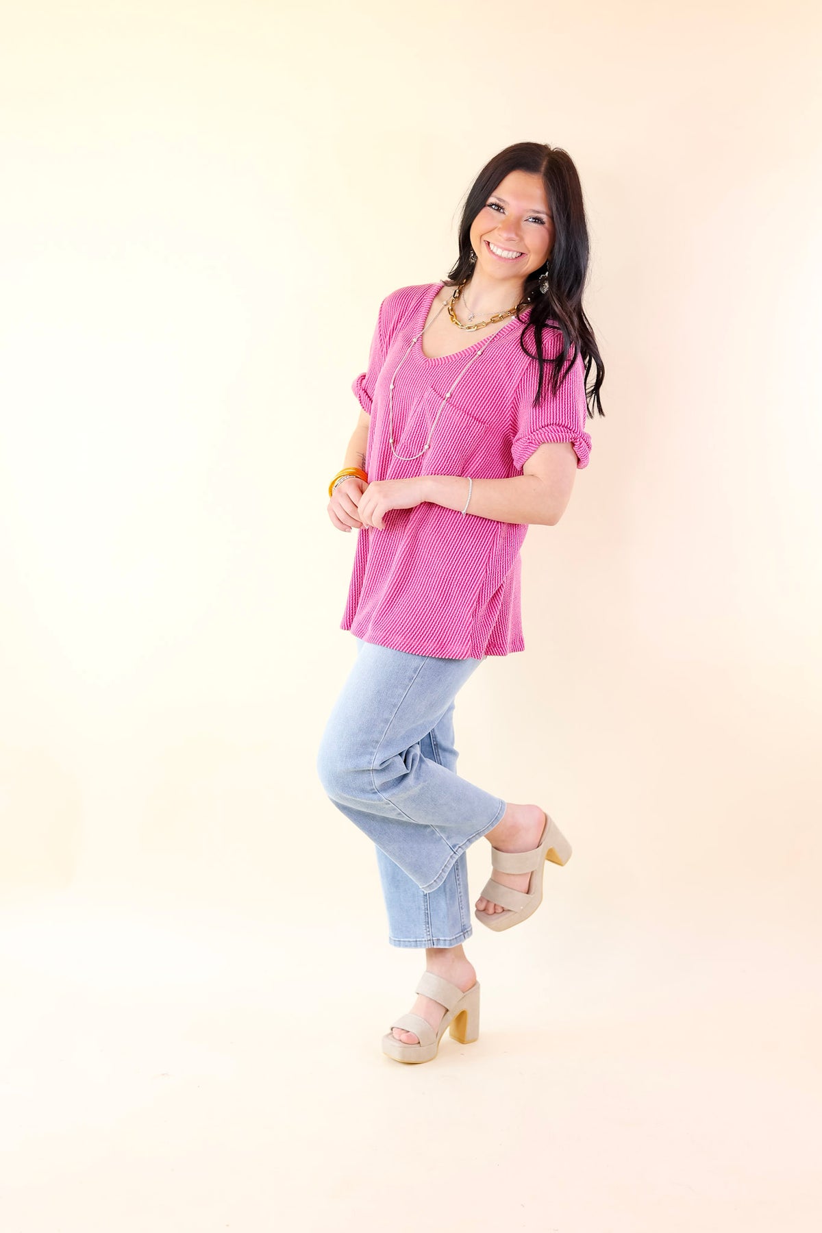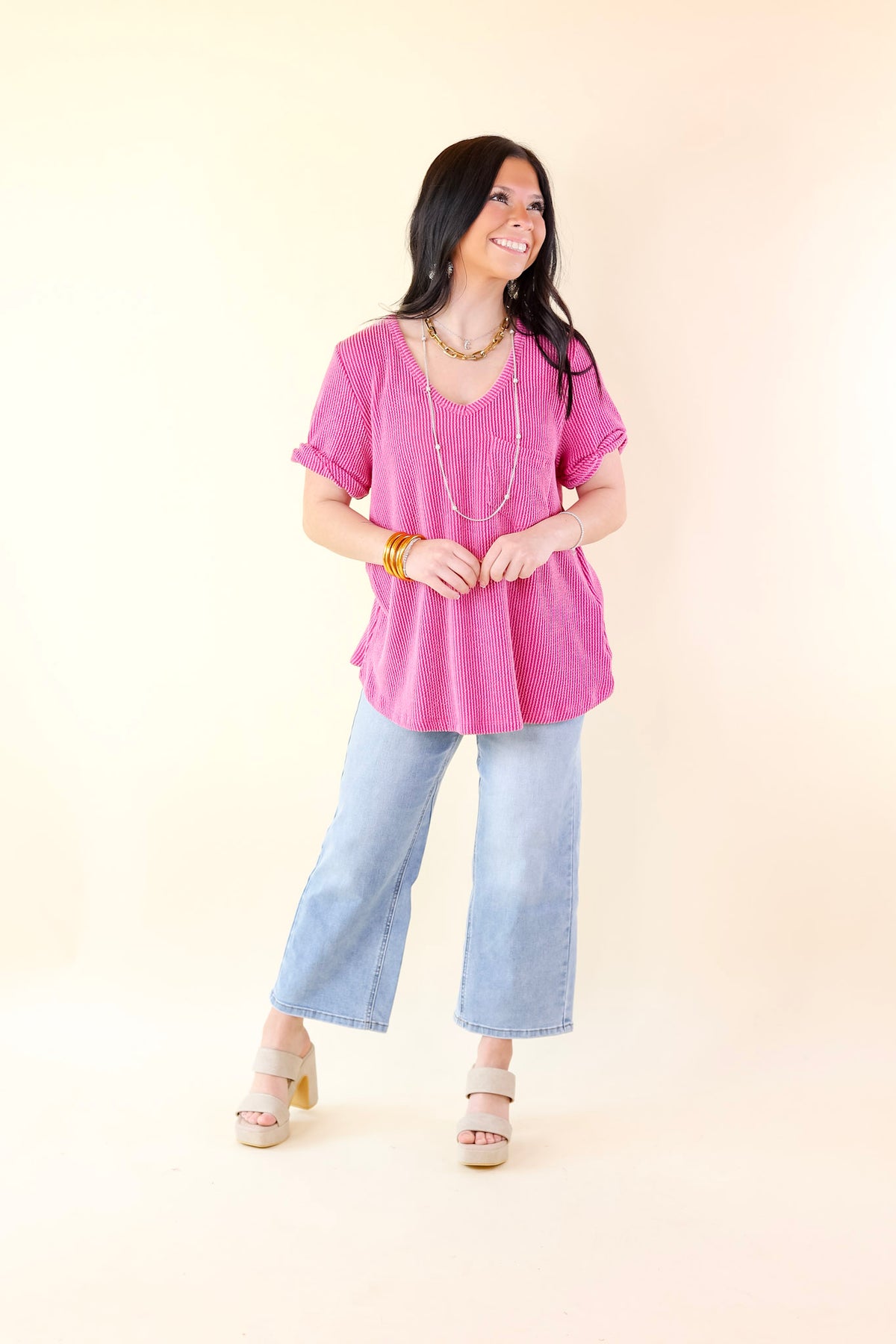 Only True Love Ribbed Short Sleeve Top with Front Pocket in Orchid Pink