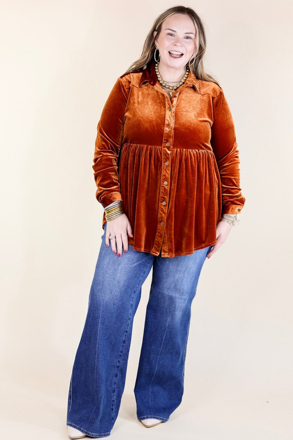 Call Me Yours Button Up Velvet Long Sleeve Babydoll Tunic Top in Burnt Orange