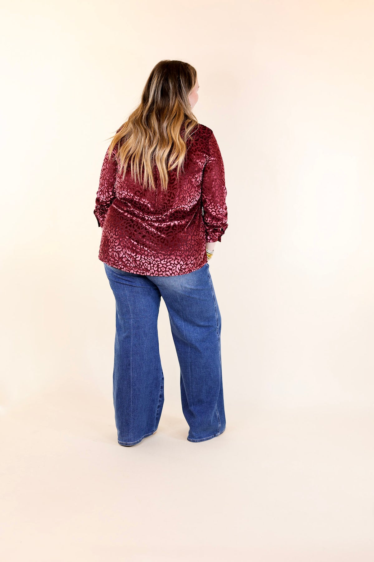 Candy Apple Evening Button Up Animal Print Velvet Long Sleeve Blouse in Wine Red
