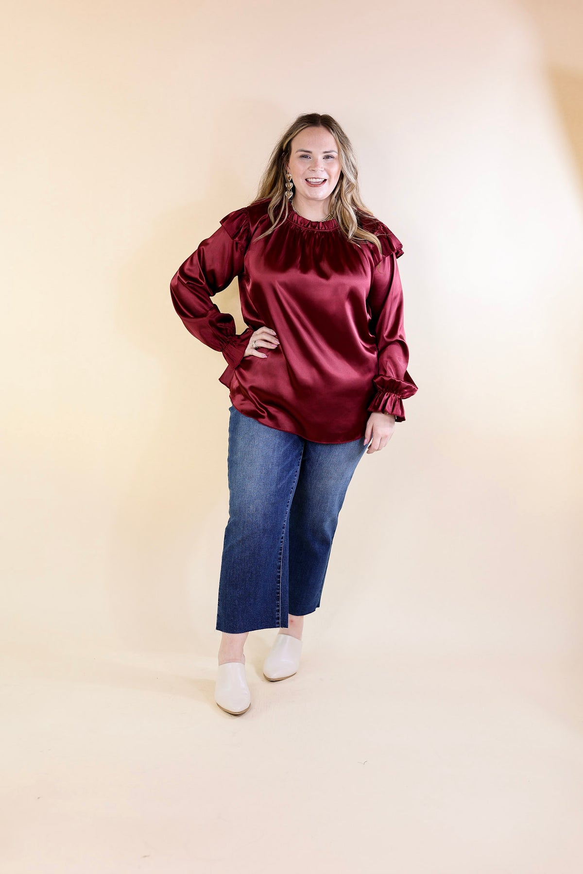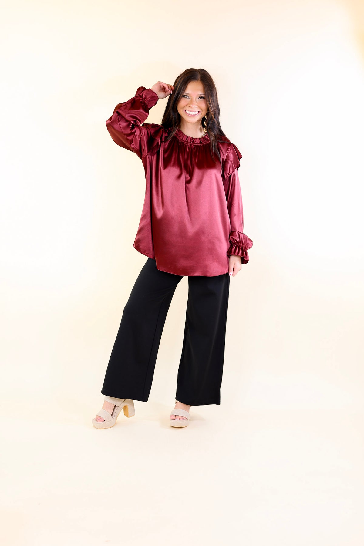 Can't Stop Me Ruffle Mock Neck Long Sleeve Satin Top in Maroon