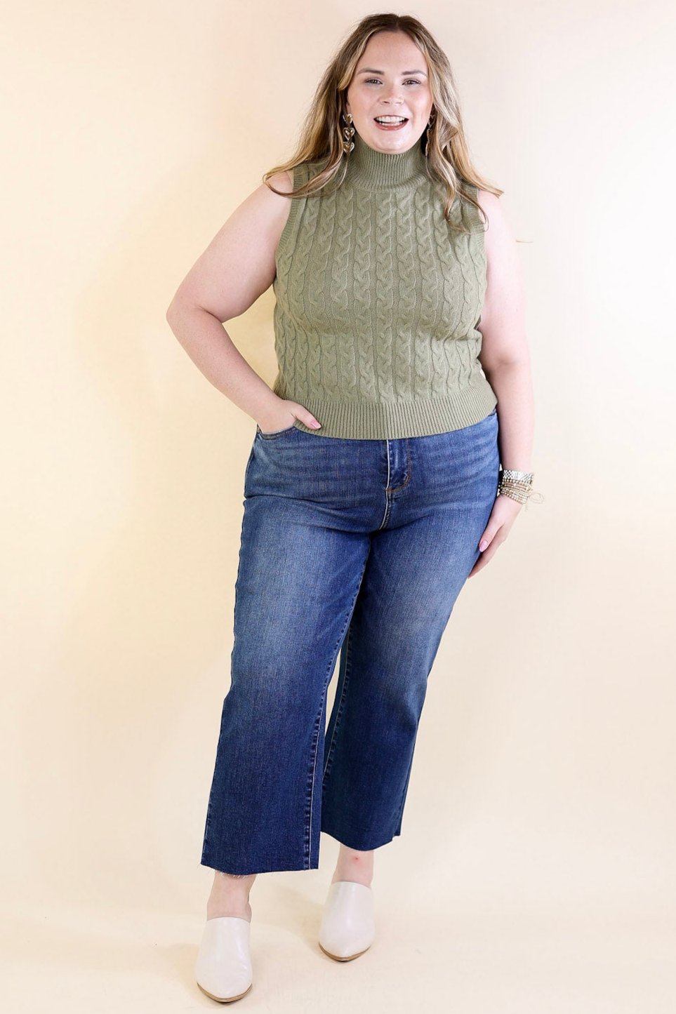 Cider Sips Cropped Sweater Tank Top with High Neck in Sage Green