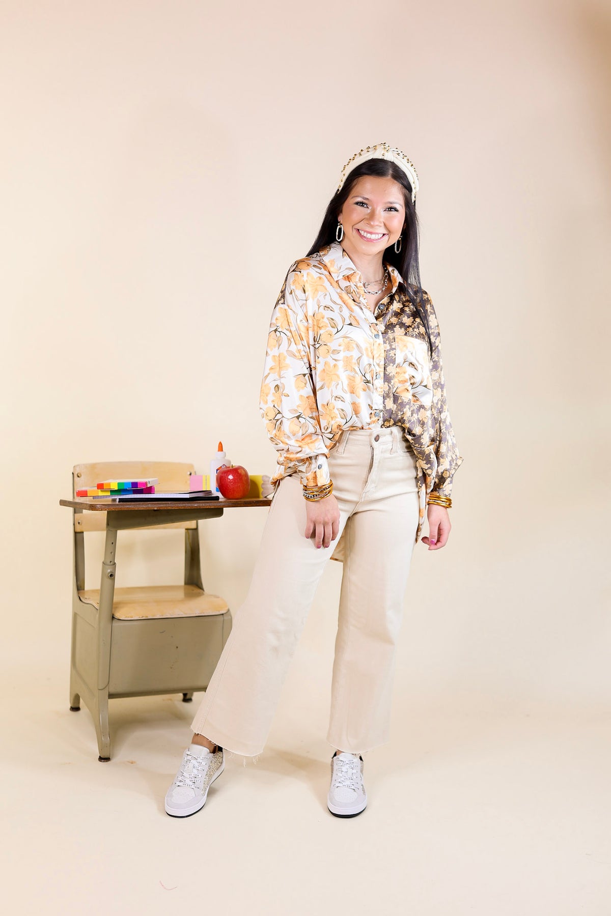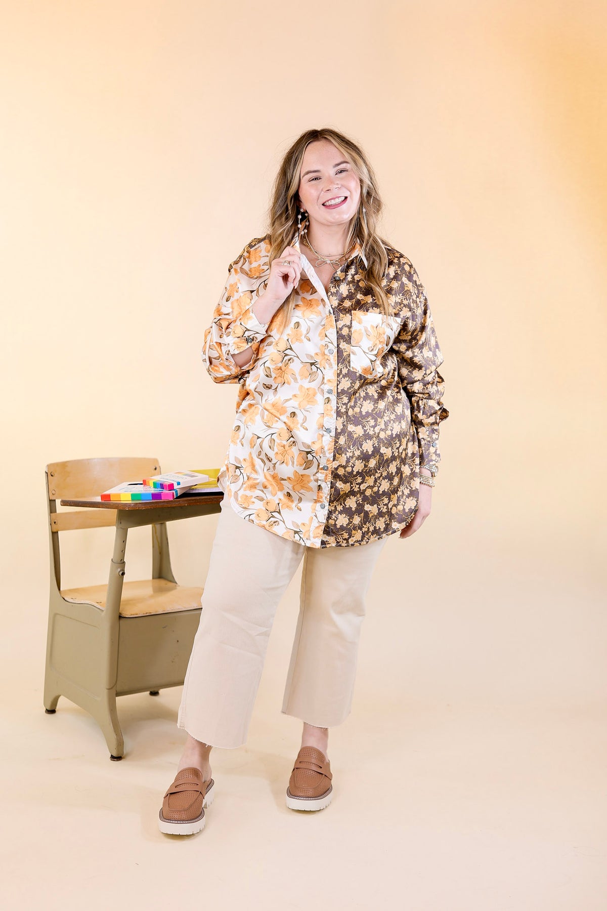 This top is giving us all the Fall feels! It includes a satin body with a mix of olive green floral print and gold floral print, long sleeves, a collared neckline, and button up front. Wear it alone or wear it open over a tank top!