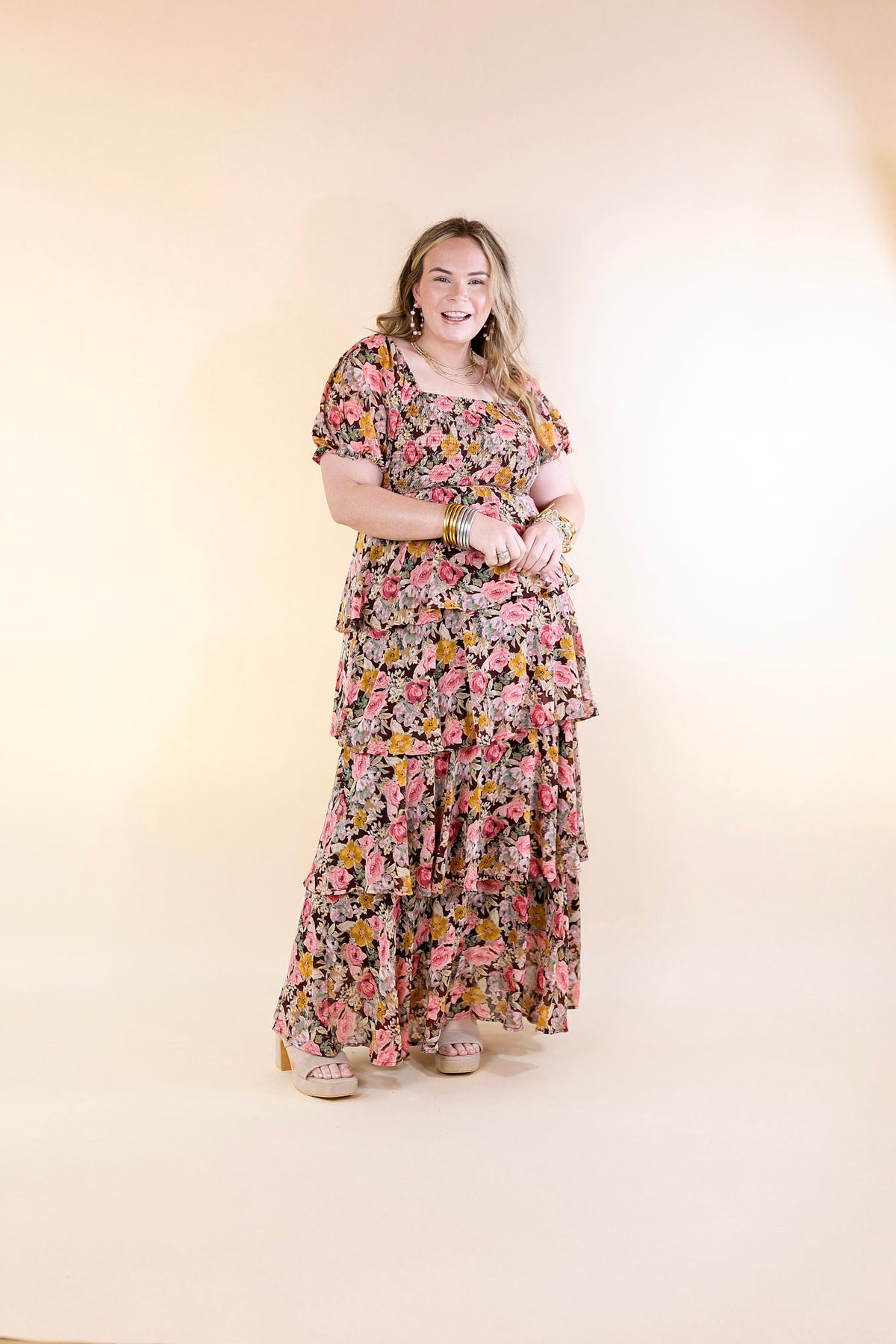 Fun Feeling Floral Tiered Maxi Dress with Smocked Balloon Sleeves in Brown Mix