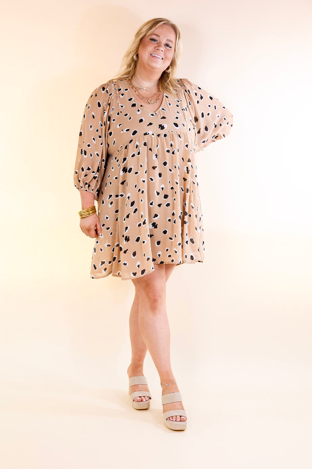 This dress is the highlight of the fall season! It includes a 3/4 length balloon sleeve, a v neckline, a flowy baby doll style body, and an ivory and taupe dotted print on a black background. Pair this with booties and a hat and you'll be ready for the season!
