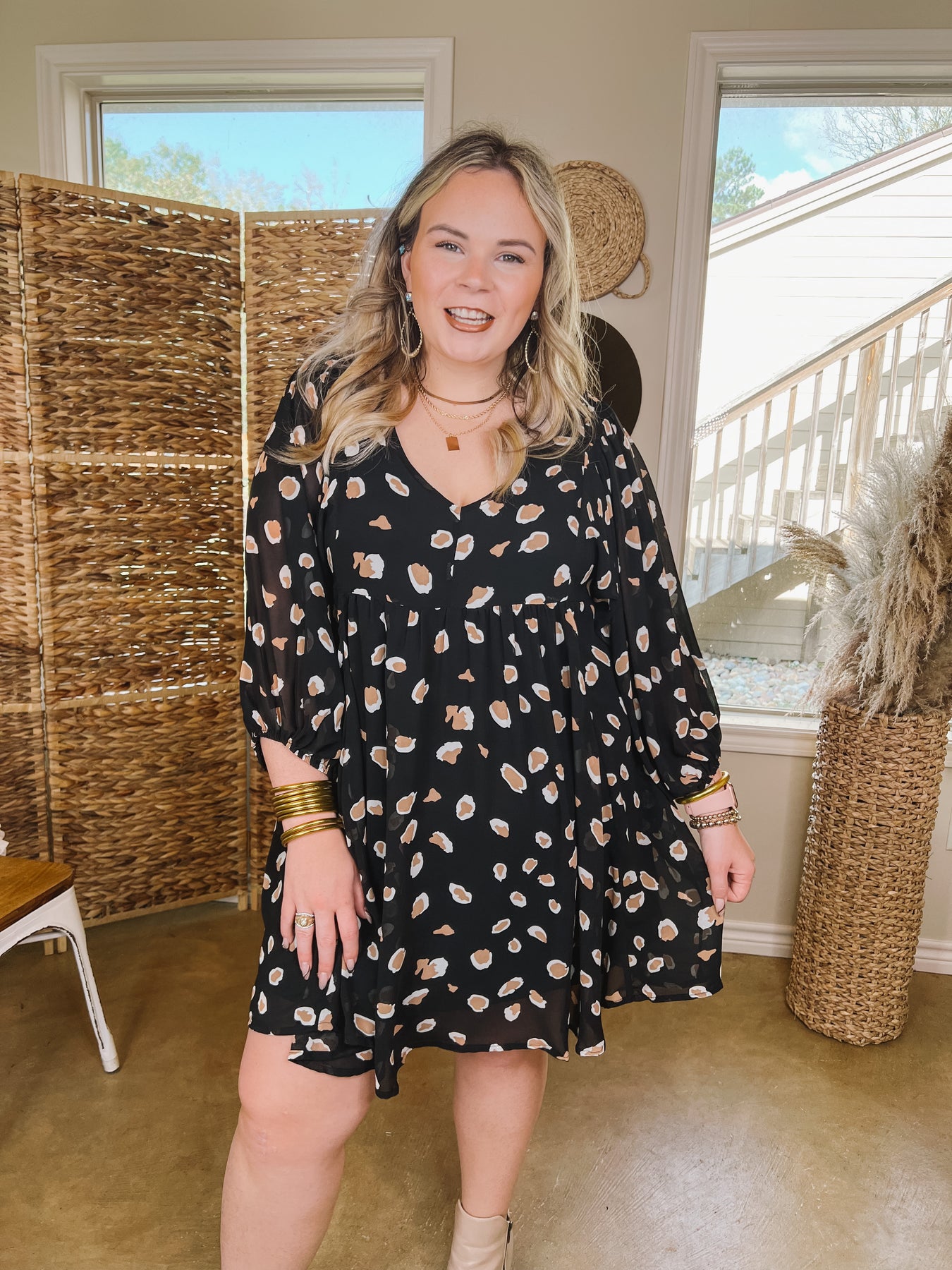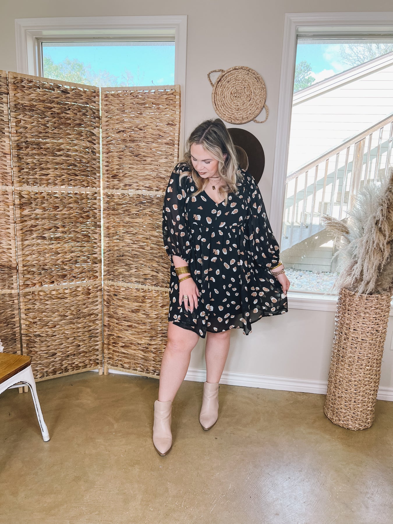 This dress is the highlight of the fall season! It includes a 3/4 length balloon sleeve, a v neckline, a flowy baby doll style body, and an ivory and taupe dotted print on a black background. Pair this with booties and a hat and you'll be ready for the season!