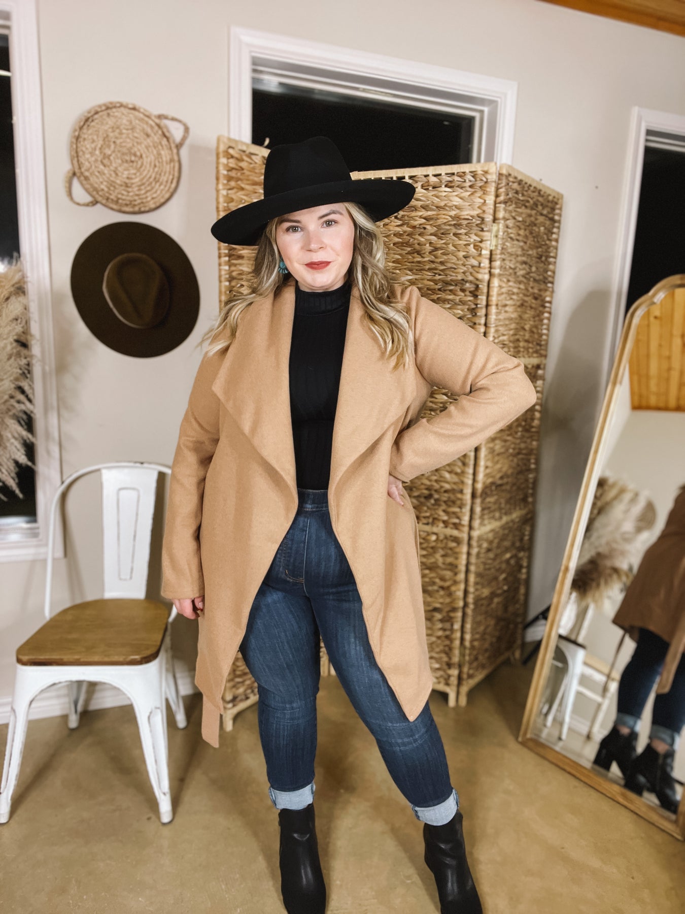 This adorable new jacket has us dreaming of New York City! It includes a long body, collared neckline, open front, long sleeves, and a detachable waist tie. Wear it over any outfit to stay warm! Abby is wearing a size large.
