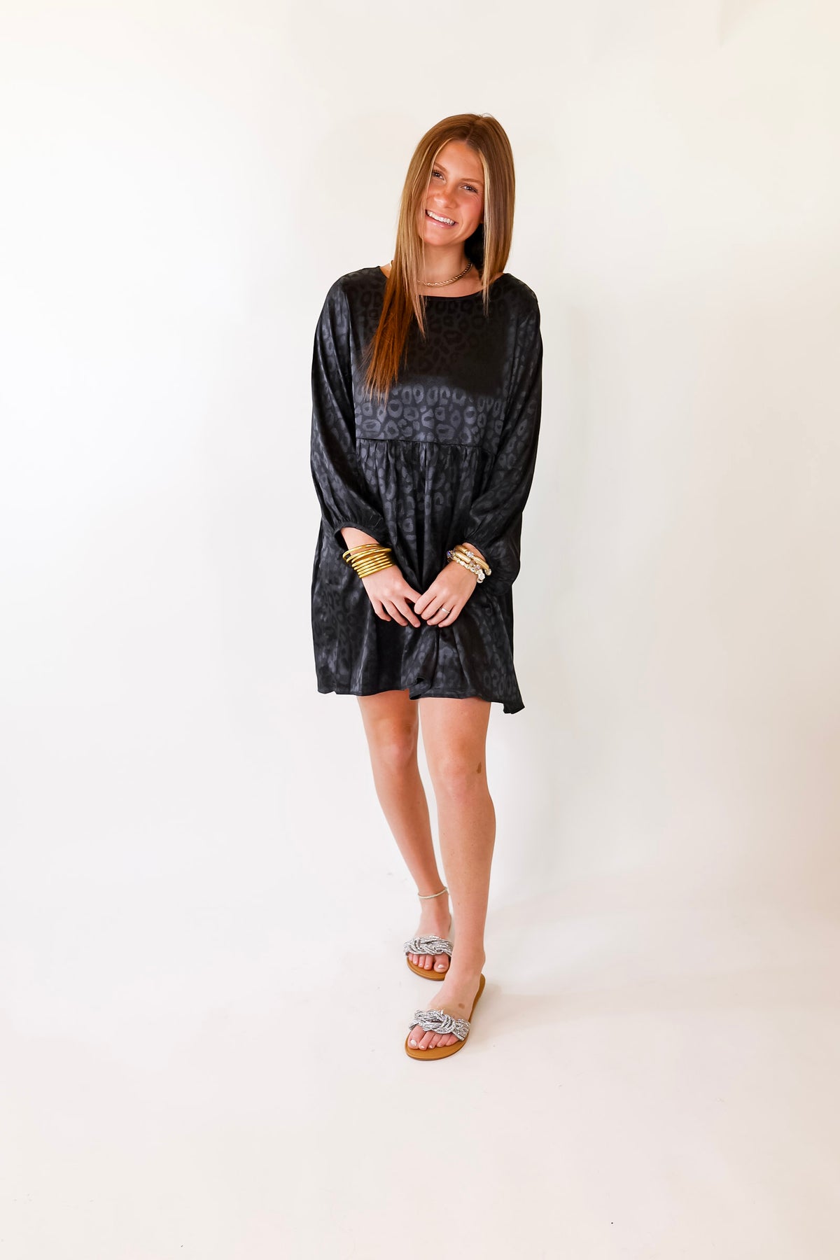 Change Is Coming Leopard Print Babydoll Dress with Long Sleeves in Black