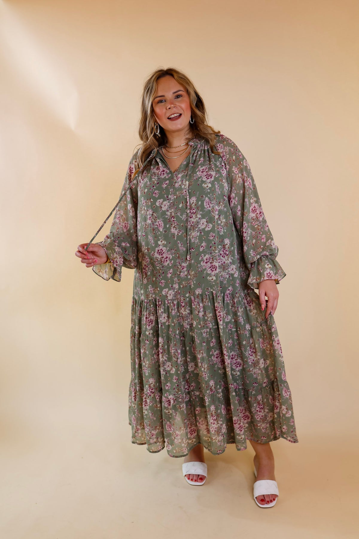 Last Chance Size Small | Tuscan Nights Long Sleeve High Neck Floral Midi Dress in Sage