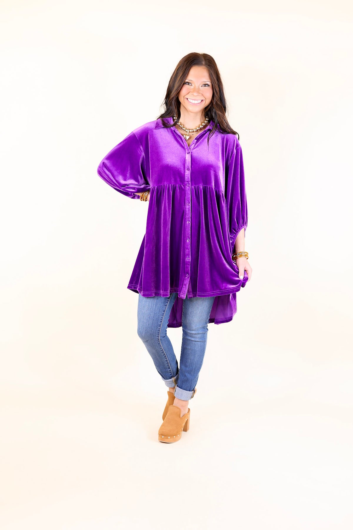 Love Link Button Up Velvet Half Sleeve Babydoll Tunic Top in Violet Purple