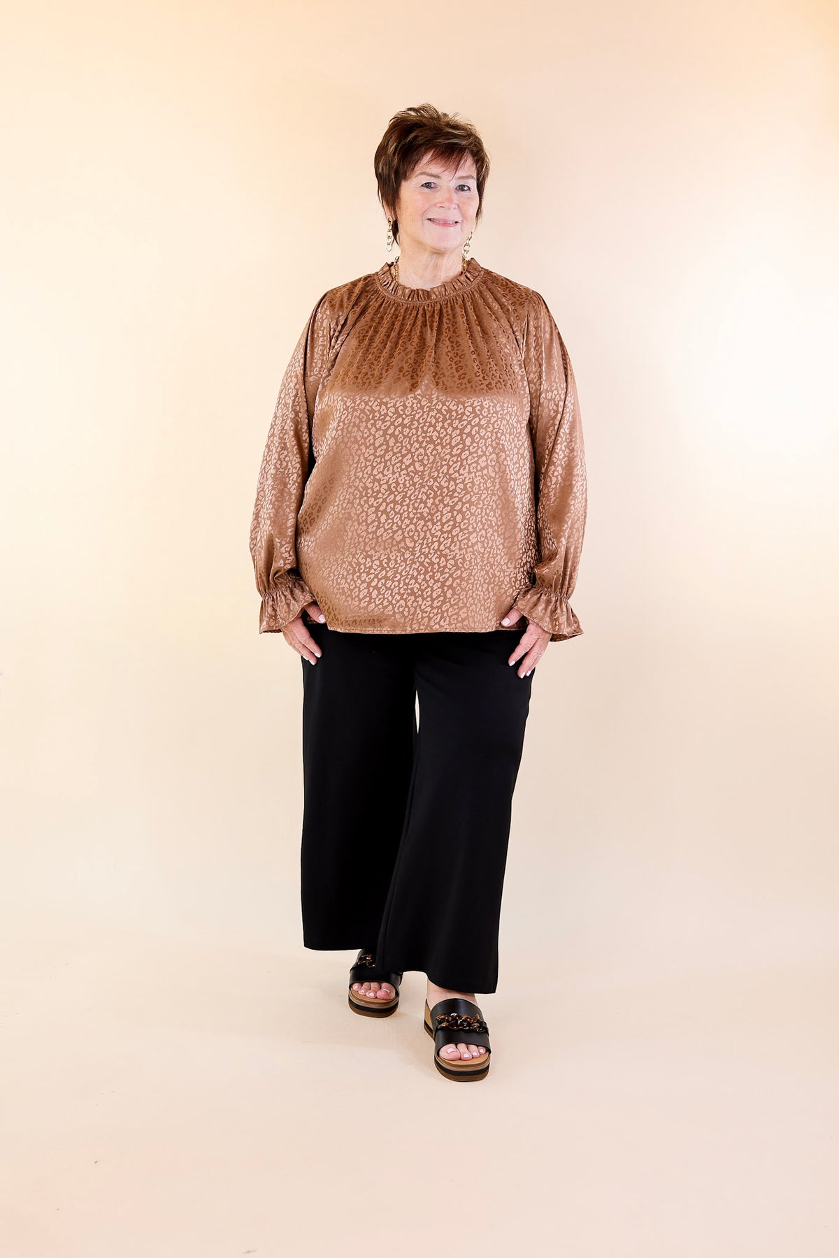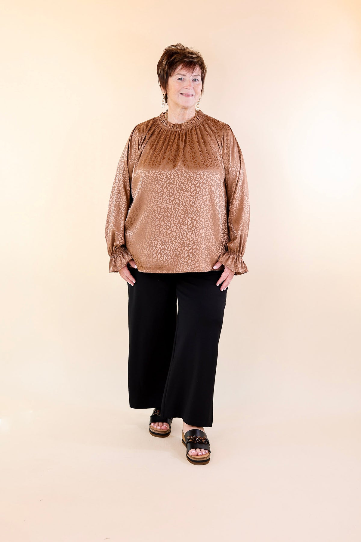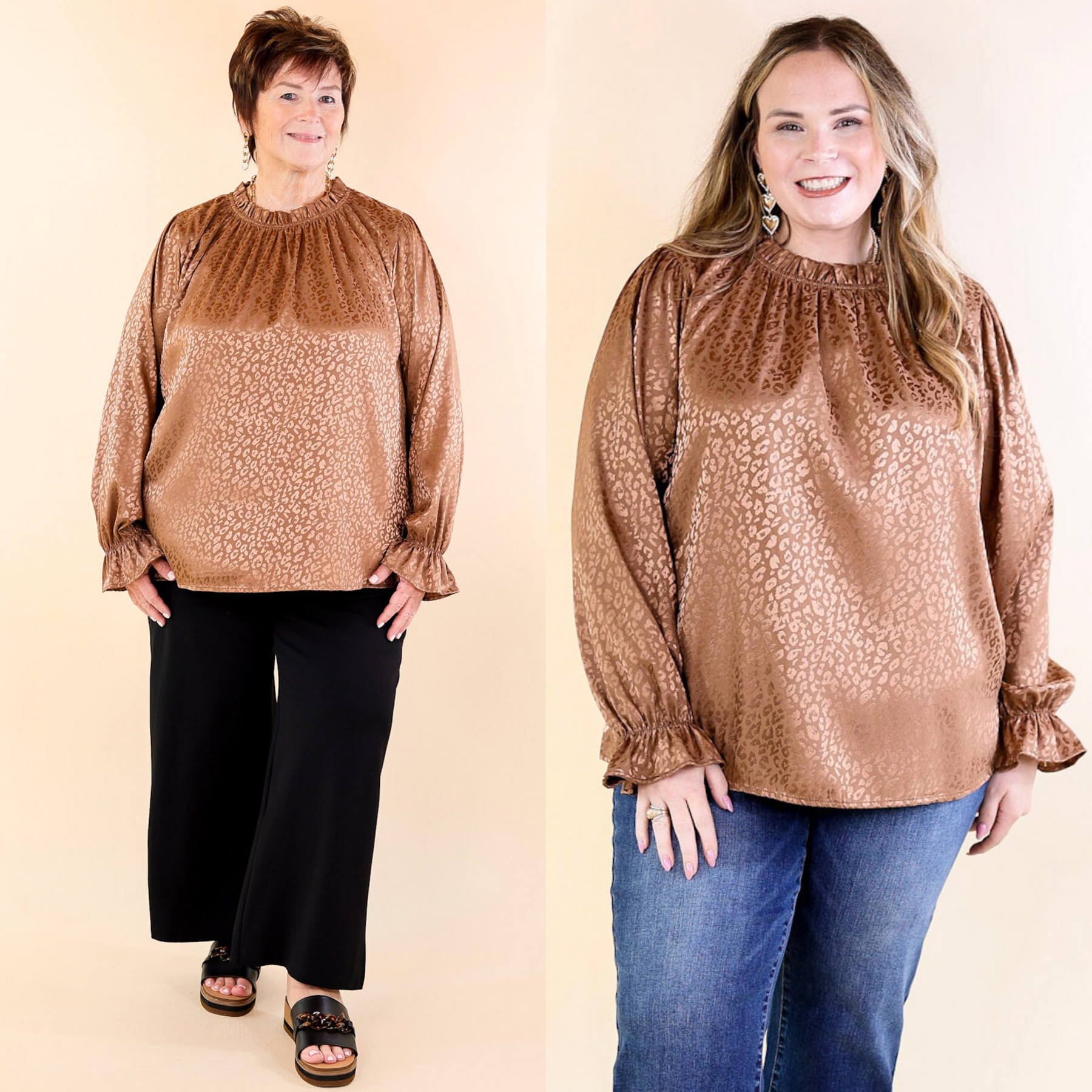 Set a good mood every time you wear this adorable new top! It includes a satin body, long sleeves with a ruffle at the wrist, and a mock neck that is ruffled. The leopard print on this top is the same color as the background, but stands out with a pretty shine. Wear it under a blazer with heels for a fun look!