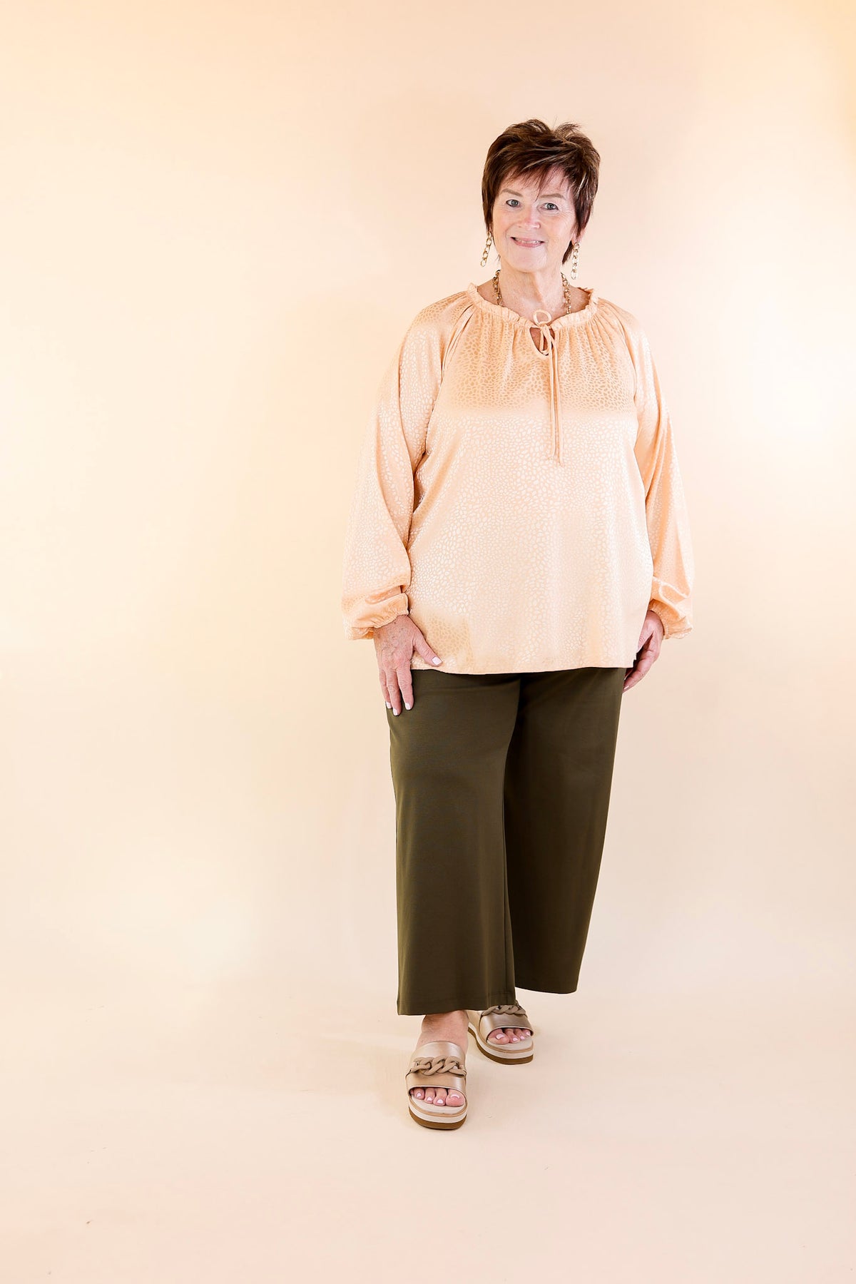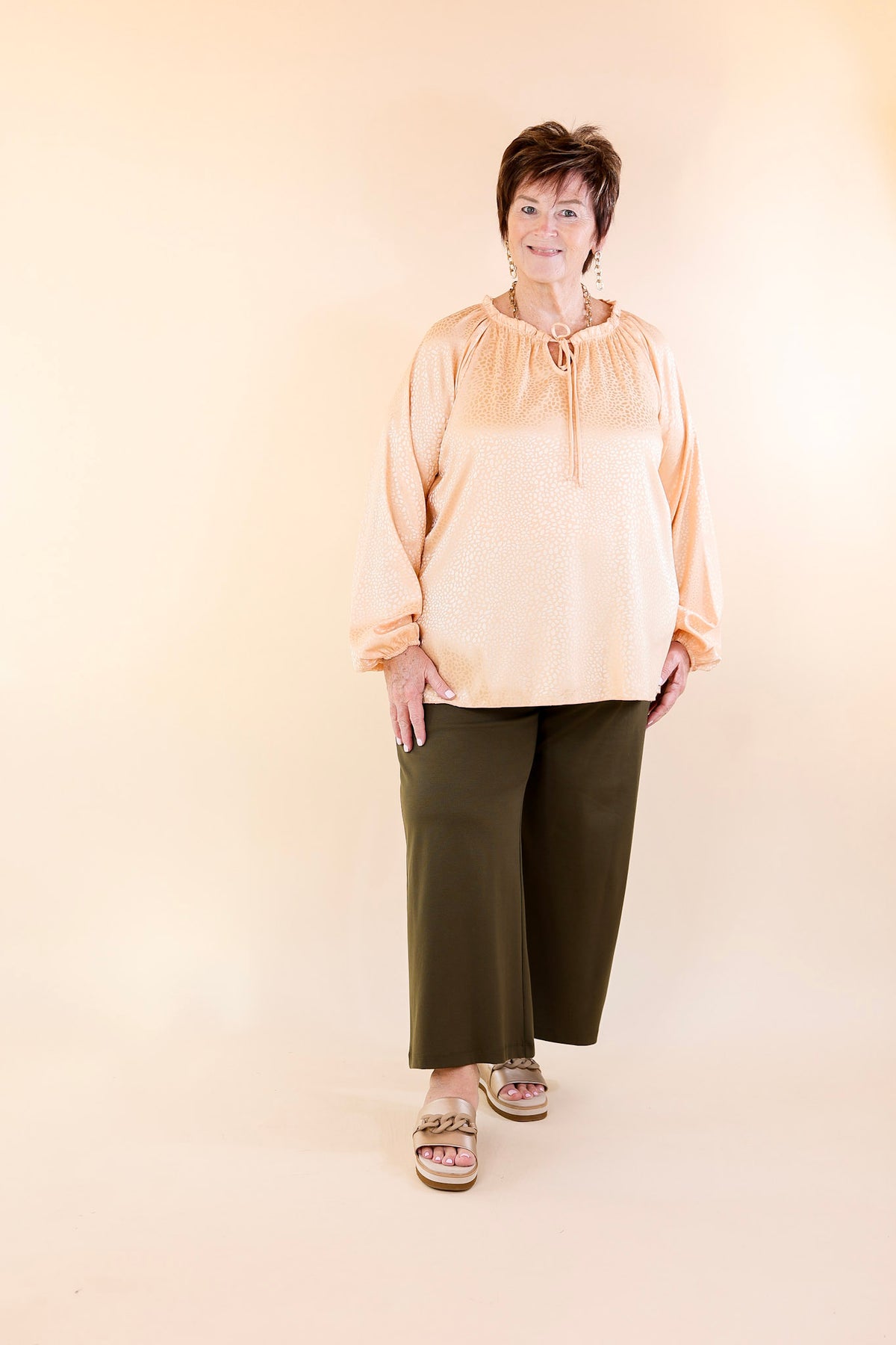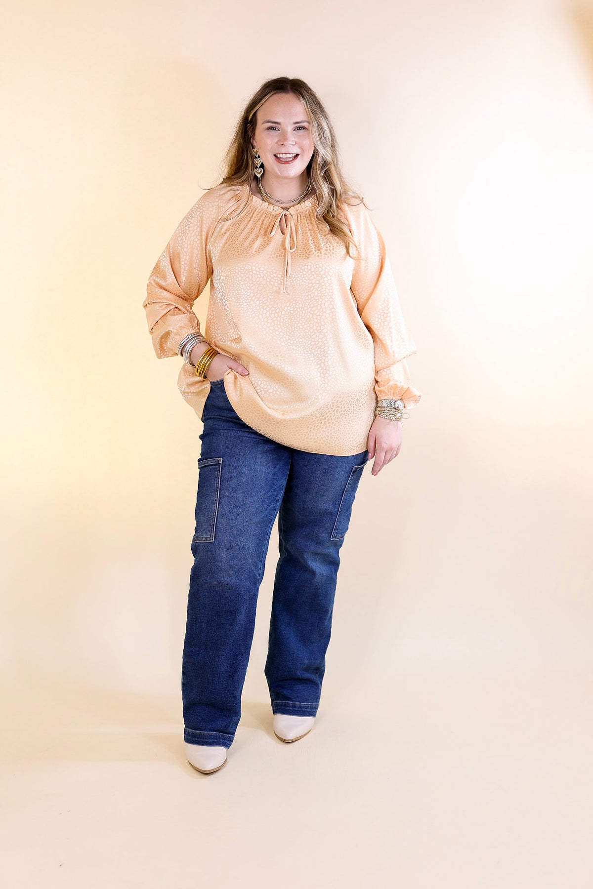 Own The Evening Ruffle Mock Neck Long Sleeve Dotted Satin Top with Keyhole in Beige