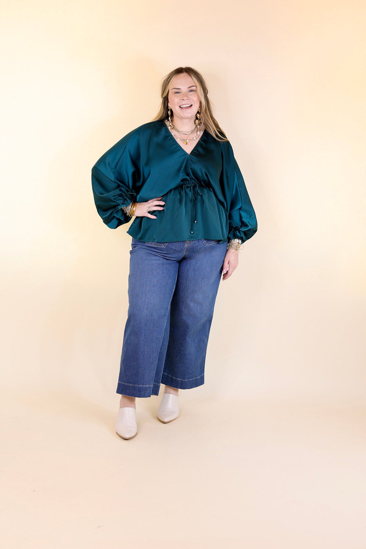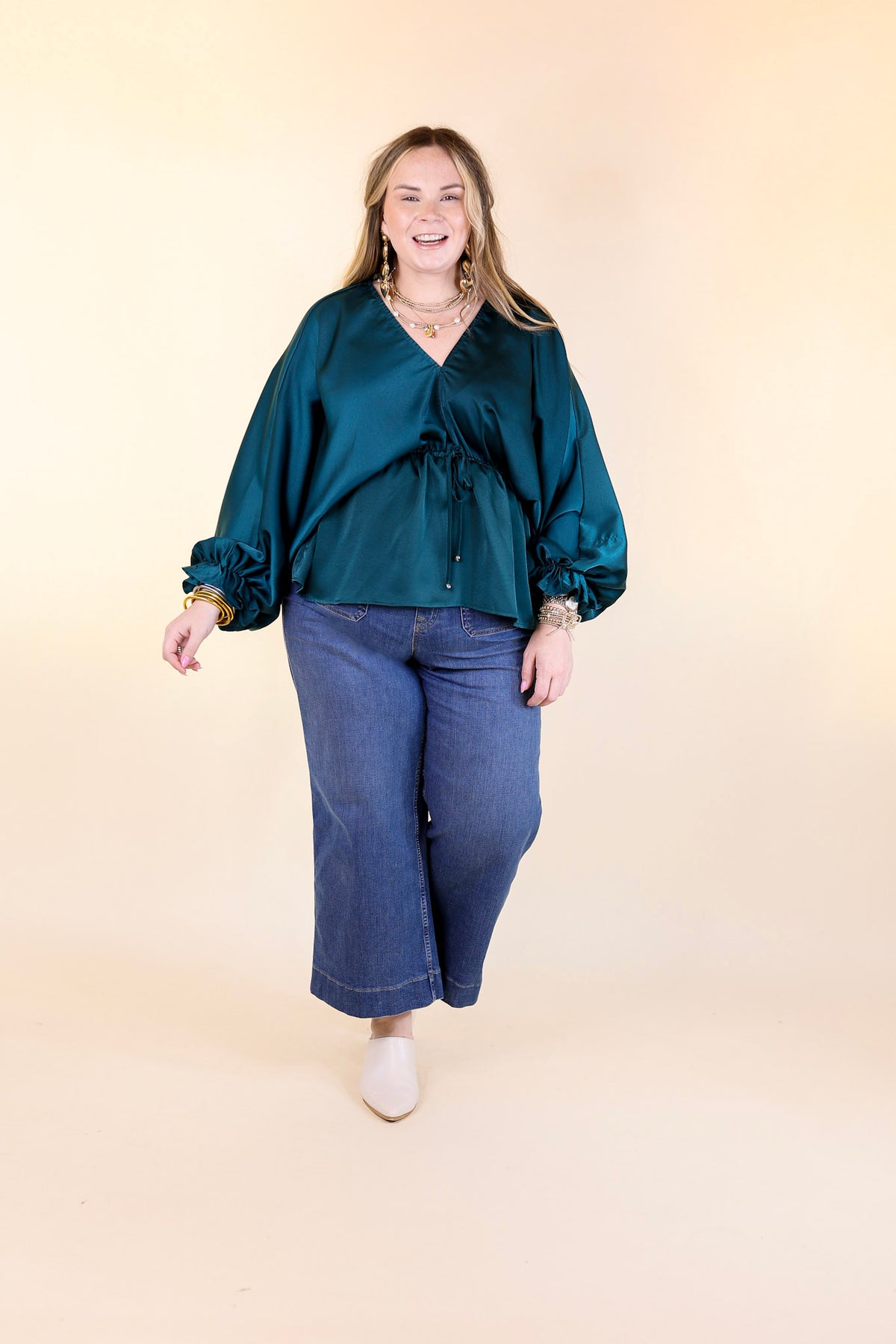 Stating Facts Satin Top with Drawstring Waist in Teal